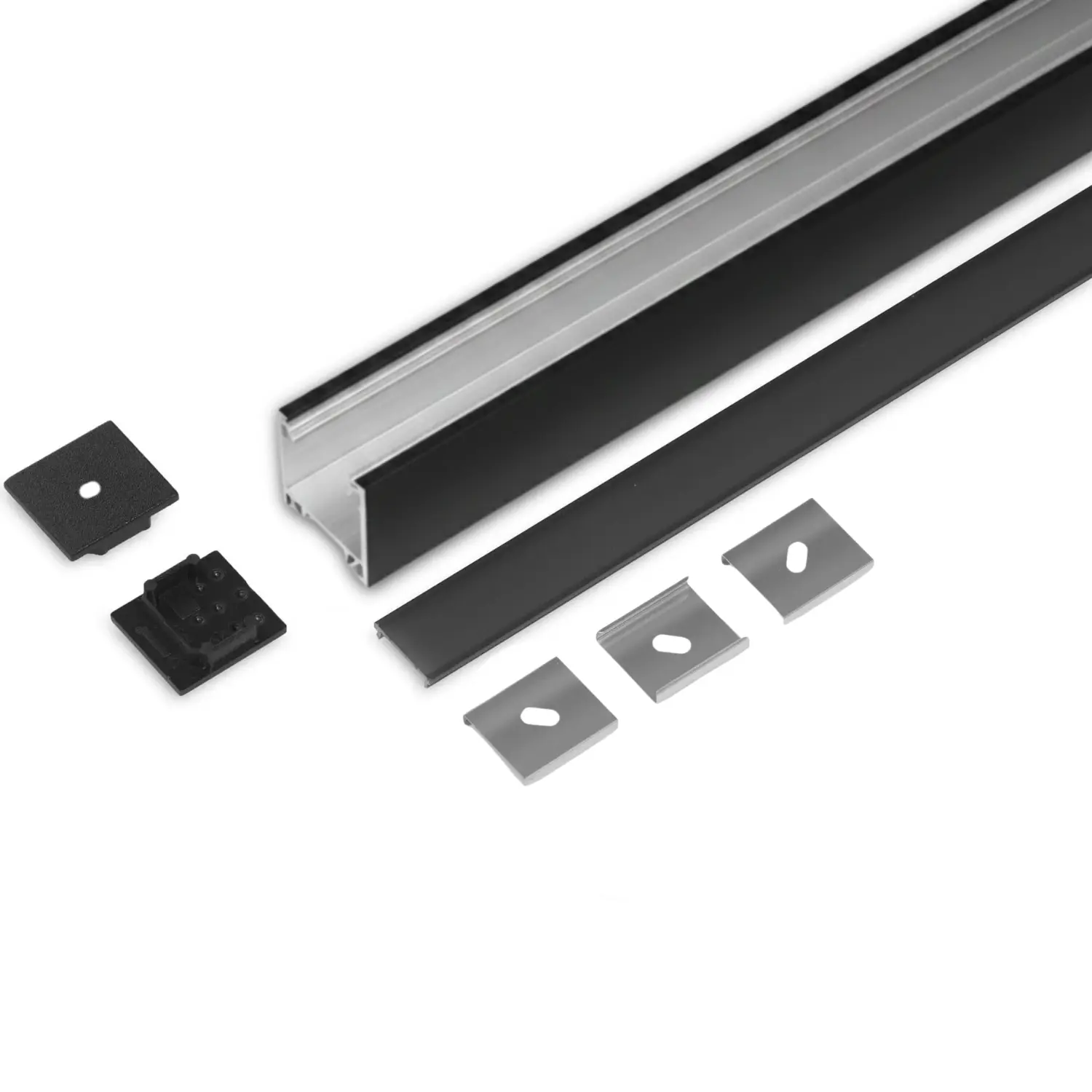 Denna aluminiumprofilsats innehåller: 1 x 2 m profil, 1 x diffusor (svart), 2 x ändlock och 3 x monteringsfästen