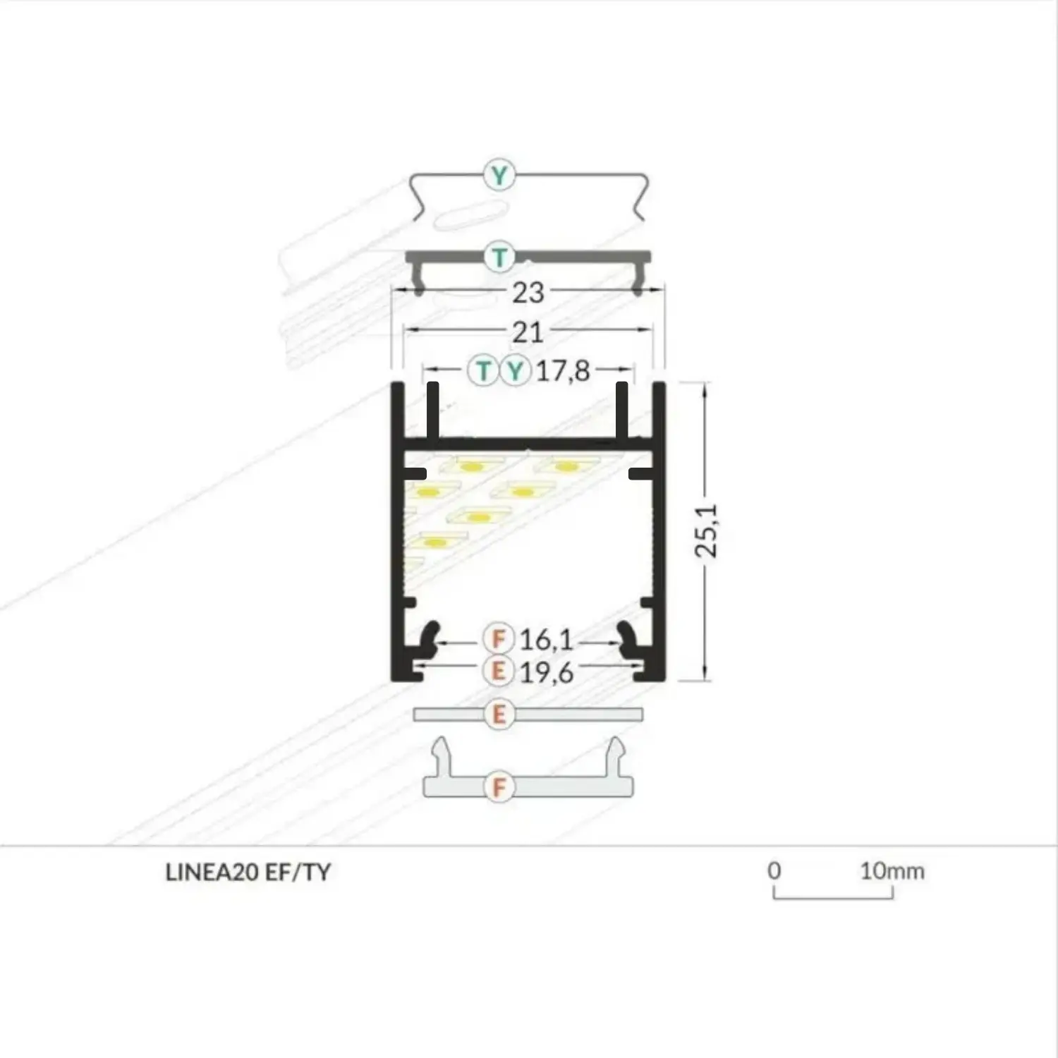 Den här aluminiumprofilen rymmer LED-lister med en bredd på upp till 21 mm, och modellen är dessutom hög, vilket ger ett bra diffust ljus och gör den tillräckligt stor för att rymma de flesta 230 V LED-lister.