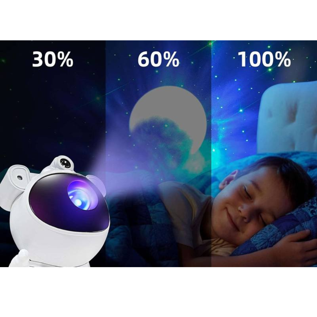 Denna astronautlampa erbjuder inte bara en stjärnhimmelprojektor, utan har även en imponerande månfunktion som projicerar en vacker och realistisk måne på väggen eller taket. Med kombinationen av stjärnor och måne kan du skapa en komplett natthimmel i ditt hem, perfekt för att skapa en lugnande atmosfär före sänggåendet eller som ett dekorativt element i vardagsrummet.