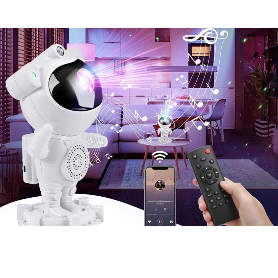 Denna astronautprojektor har en RGB LED laser som ger ett imponerande ljus och Bluetooth anslutning så att du kan strömma din favoritmusik direkt. Idealisk för hemmet där design och funktionalitet går hand i hand.