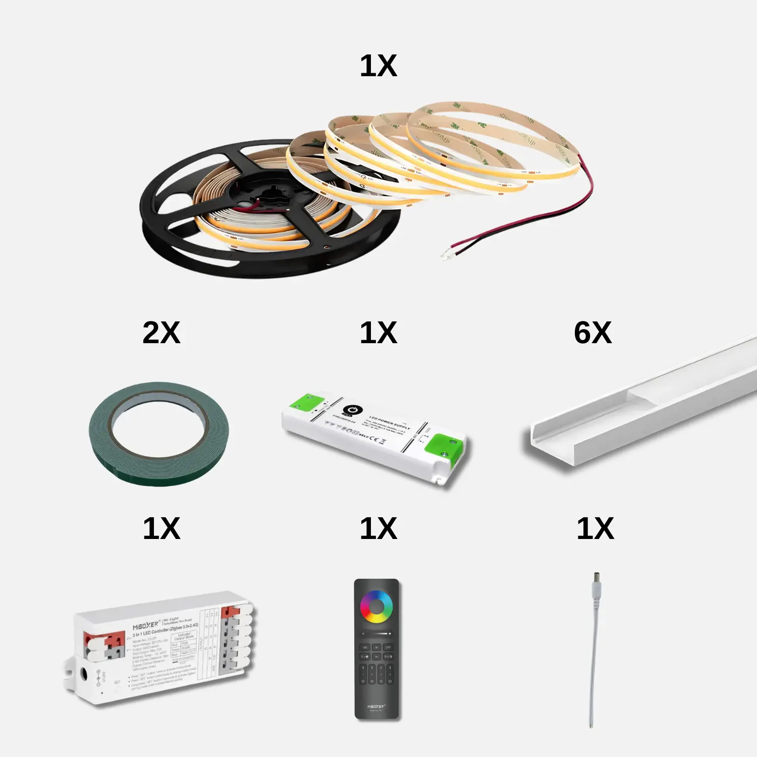 2 398 SEKKomplett 5 m COB RGBW ljuslistpaket med Zigbee-kontroller, RF-fjärrkontroll, 24V-drivdon och 5x aluminiumprofiler. Ger jämnt ljus och miljontals färger – enkel montering och full kontroll via app eller röststyrning.