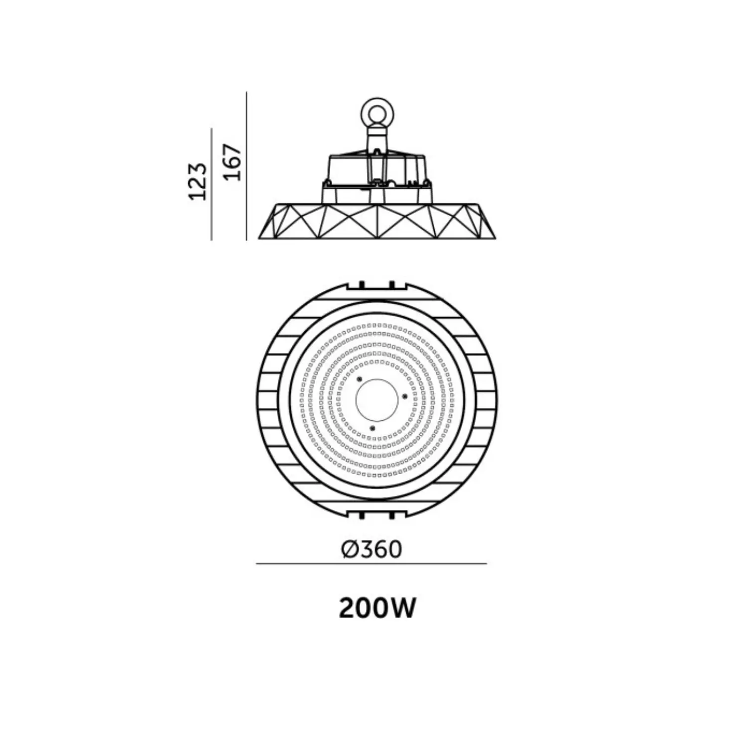 ANICA är en professionell LED High Bay industrilampa på 200W som levererar 36.000 lumen med en effektivitet på 180 lm/W. Den är idealisk för hallar, lagerbyggnader, produktionsmiljöer og sportanläggningar där kraftig og jämn belysning krävs.