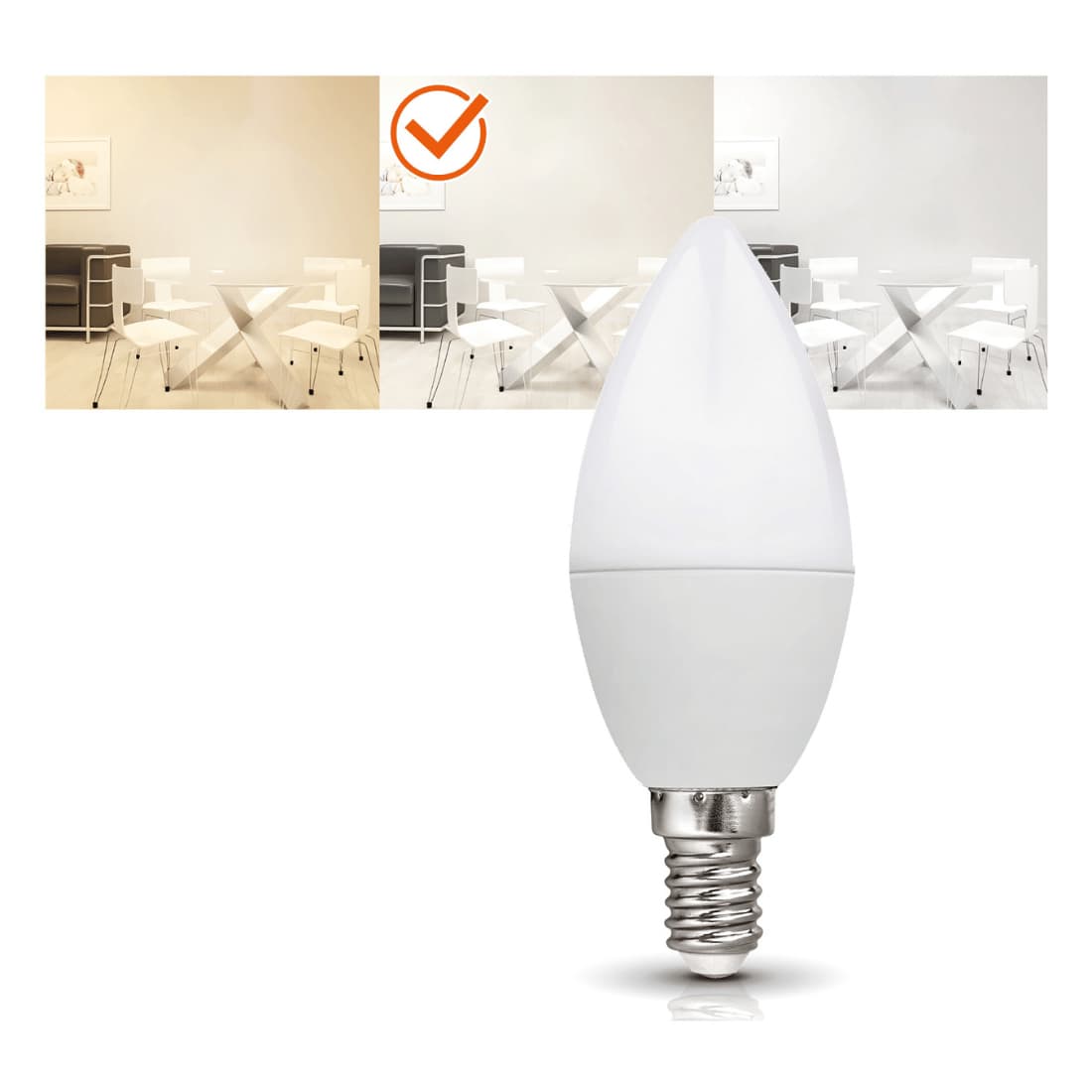 Denna lampa har en långsträckt form (ljuslampa) med en E14 sockel. Blir inte varm och lyser direkt när den slås på. Lyser som en glödlampa med en strålvinkel på 200°. lampan har en neutral vit färgtemperatur på 4000K, vilket ger ett klart och naturligt ljus. Denna färg är idealisk för områden där hög synlighet och koncentration krävs, som t.ex kontor eller studior.