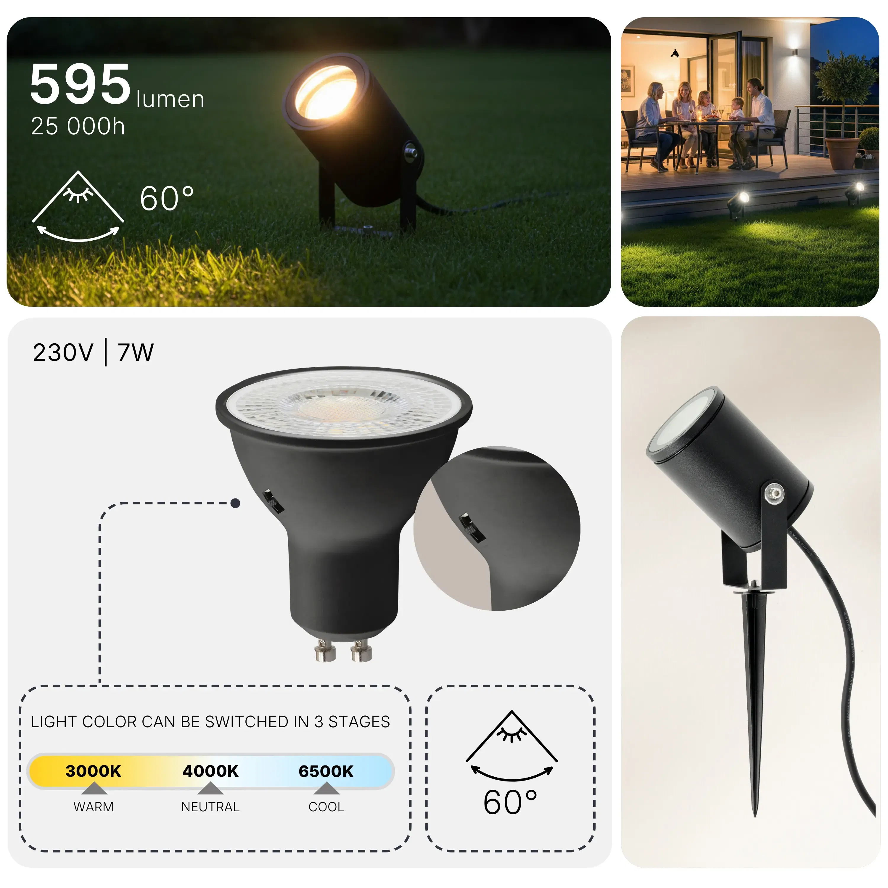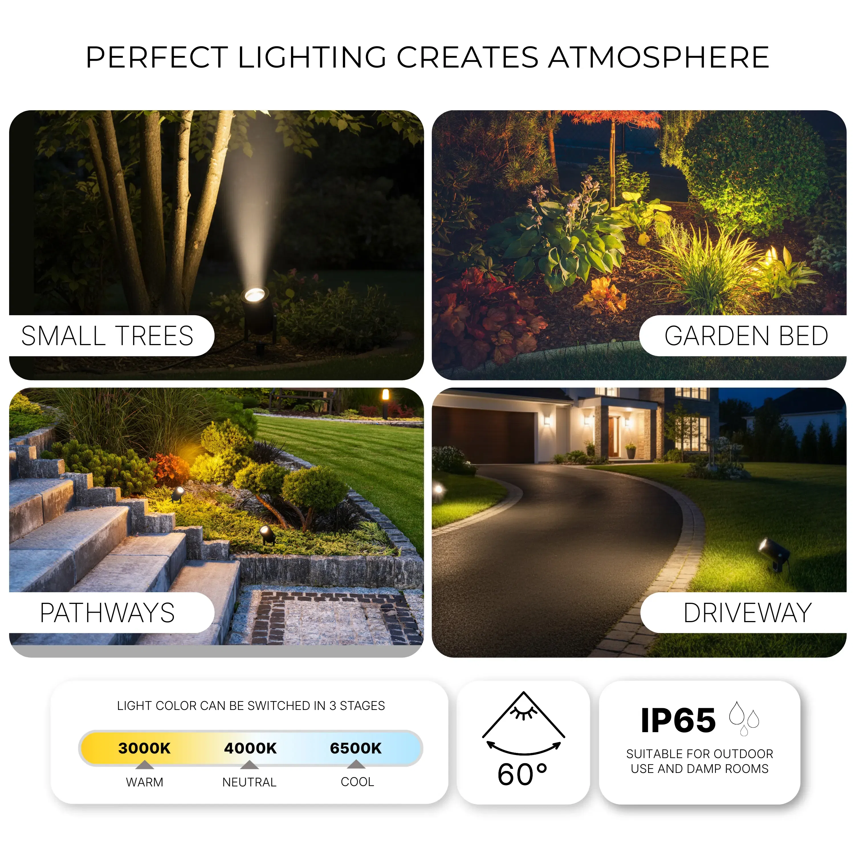 Med den inbyggda CCT-funktionen kan du välja mellan tre ljusfärger, så att din trädgårdsspotlight kan anpassas efter både humör och funktion. Oavsett om du vill skapa trivsel, säkerställa god orientering eller framhäva detaljer i trädgården ger den här lösningen dig full kontroll. Trädgårdsspotten kan lutas och vridas så att ljuset träffar precis där du vill ha det.