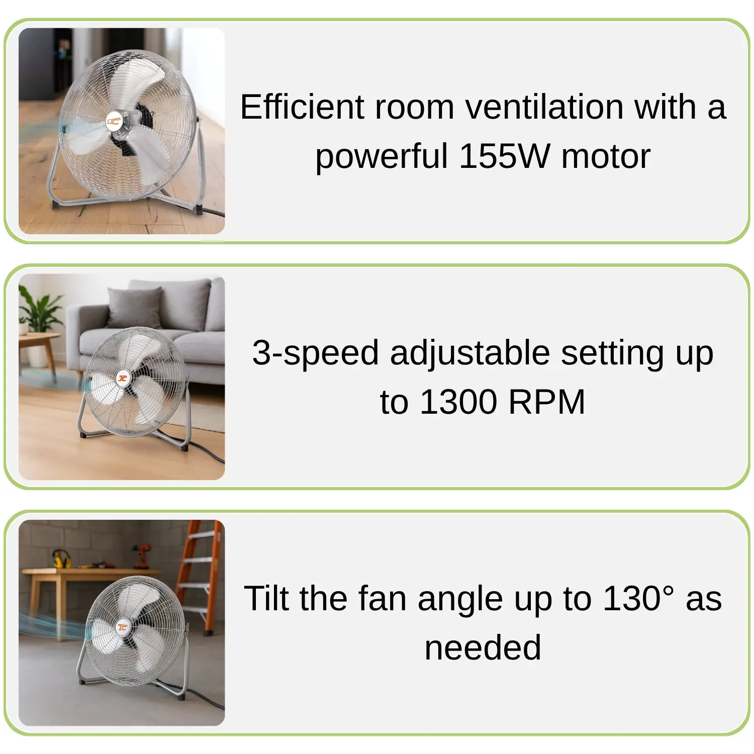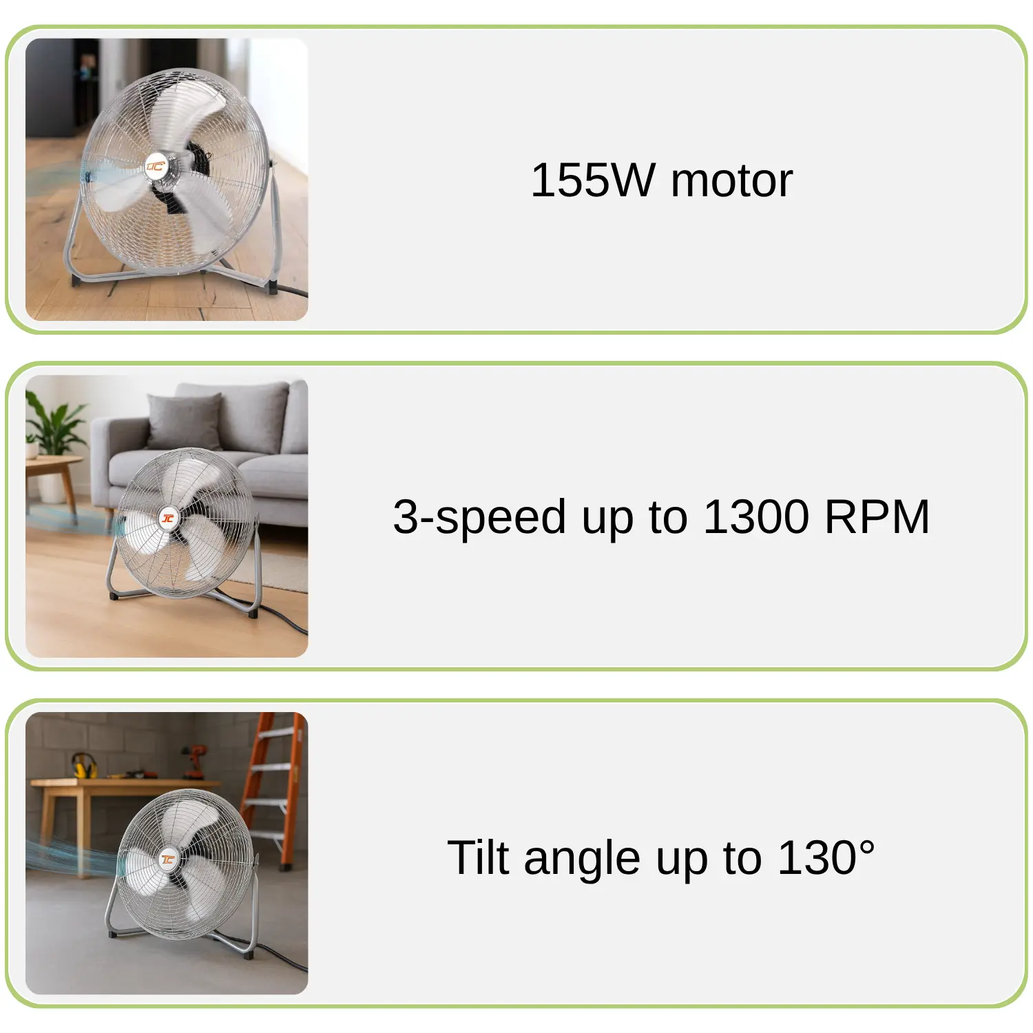 Detta paket med 4 kraftfulla golvfläktar på 155W är ett utmärkt val för dig som behöver effektiv nedkylning i större utrymmen som verkstäder, lagerlokaler eller gym. Med en diameter på hela 50 cm levererar varje fläkt ett starkt och brett luftflöde som snabbt sänker temperaturen och skapar ett mer behagligt inomhusklimat.Robust golvfläkt med justerbar lutning