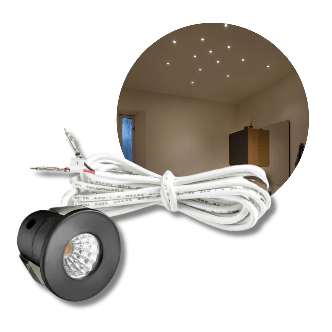 Med denna stjärnhimmelspot får du en spotlight mini som passar perfekt i taket i alla rum där du vill ha en subtil och elegant ljuseffekt. Denna mini LED spot är designad för att skapa en lugn och mysig atmosfär, idealisk för både sovrum och vardagsrum. Med sin svarta finish fungerar den som en diskret och stilfull svart spotlight för taket, som enkelt kan integreras i varje modern inredning. Oavsett om du använder den ensam eller som en del av en stjärnhimmelinstallation, är denna spot en praktisk och estetisk belysningslösning.