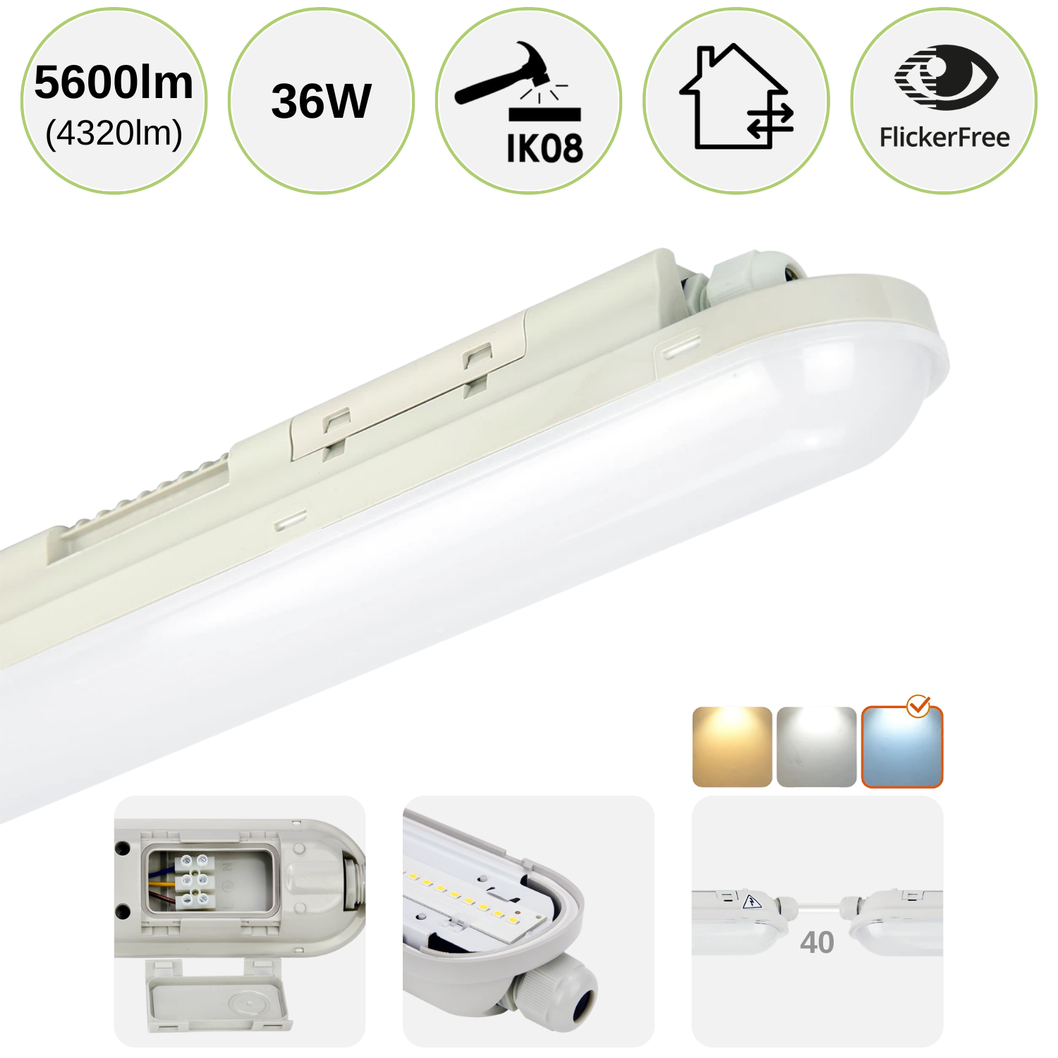 Armaturen ger ett imponerande ljusflöde. Själva LED-källan har ett ljusflöde på hela 5600 lumen, uppmätt utan täckglas eller andra komponenter. Det visar den starka ljuskällan. När konstruktionen och täckglaset räknas med, är det faktiska ljusflödet 4320 lumen (120 lm/W) – mer än tillräckligt för att ge stark och jämn belysning i krävande miljöer som verkstäder, lager och industrihallar.Robust LED-belysning med IP65 och IK08