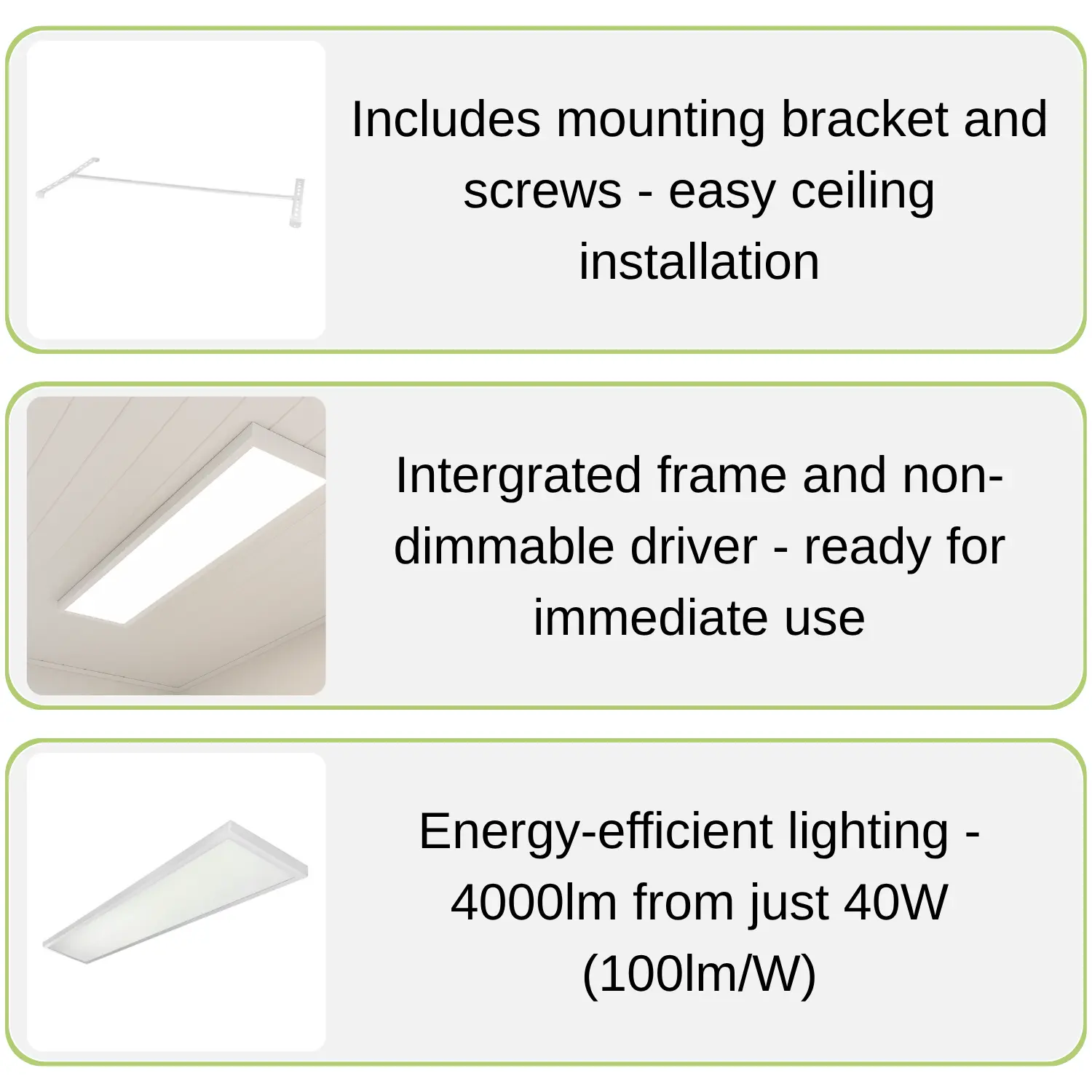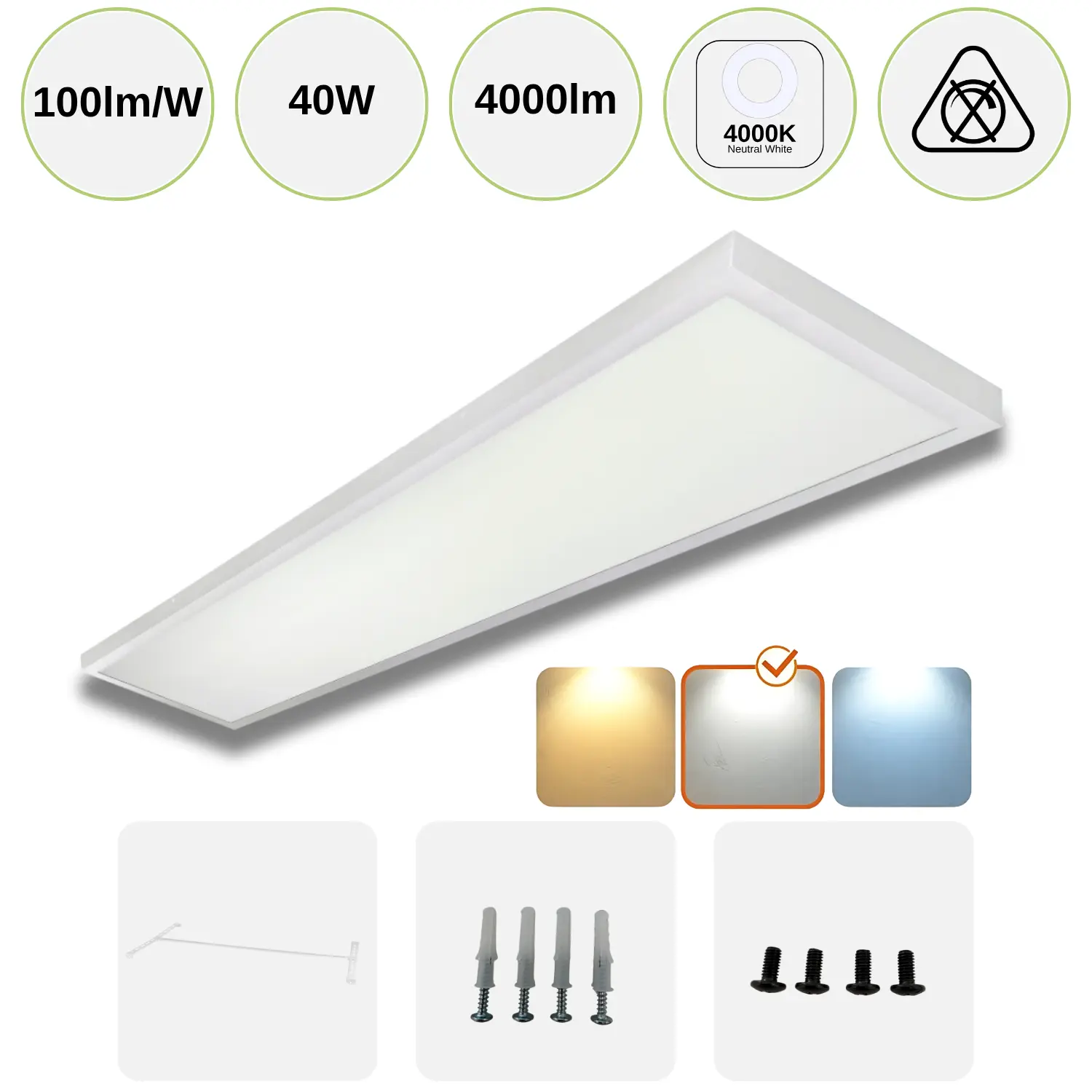 Panelen levereras med både monteringsfästen och skruvar, så att du snabbt och enkelt kan installera den direkt i taket. Den är utformad med flexibilitet i åtanke, och den smarta 2-i-1-designen möjliggör både utanpåliggande montering direkt i taket eller inbyggnad i ett Armstrong-systemtak. Denna mångsidighet gör den idealisk för både nyproduktion och renoveringsprojekt.Hållbar och energieffektiv lösning för professionella miljöer