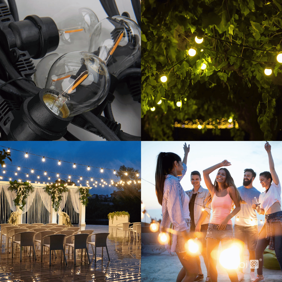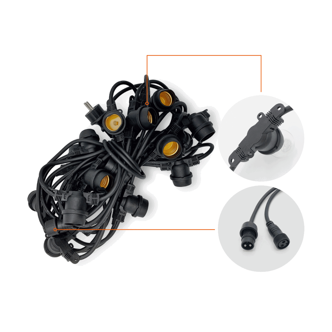 Perfekt E27 fest ljusslingor för sommarfesten eller dekoration längs tältduken eller förtältet. Ljuskedjan är 10m lång och har 20 st. E27 uttag. Ljusslingor kan enkelt förlängas via kopplingar i båda ändar (max 40 lampor).