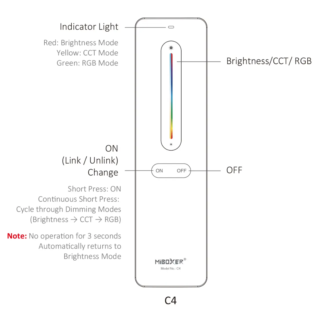 MiBoxer C4 fjärrkontroll ger dig enkel och flexibel styrning av ditt belysningssystem. Med 2.4G RF-teknologi kan du enkelt justera ljusstyrka, färgtemperatur och färger för optimal atmosfär. Perfekt för både hem och professionella miljöer.