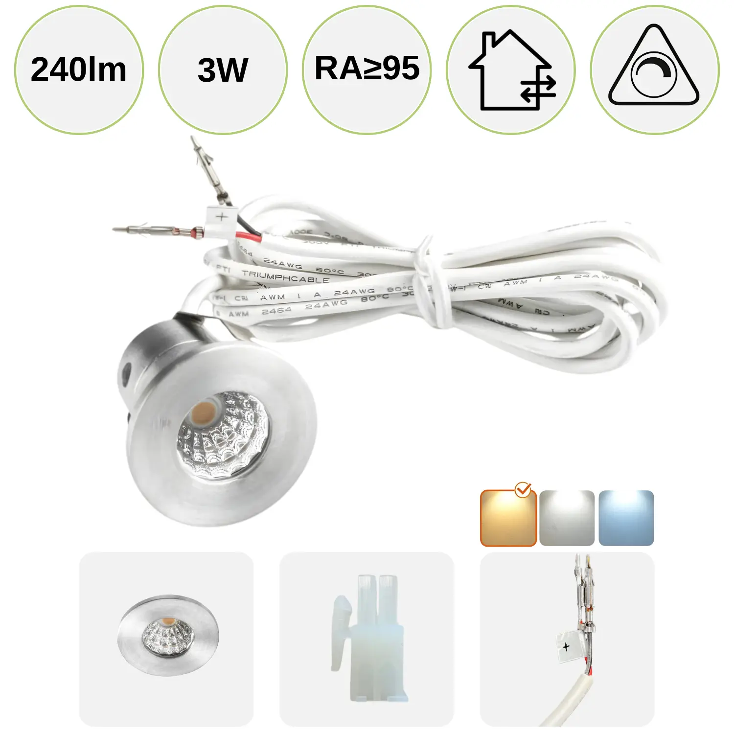 Den här vackra och superenkla minispotlighten är perfekt för möbler, väggar eller tak. Du får en enda spotlight med en låg förbrukning på 3W. Spotlighten har en färgtemperatur på 2800K (varmvit) och ger 240lm. Det är möjligt att dimma denna spot med våra 12V LED-drivdon