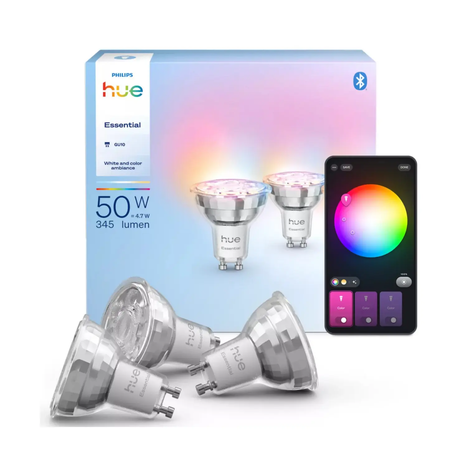 Philips Hue GU10 3 pack med Essential färger och vitt ljus. 345lm, 2200K till 6500 K, 90° spridning och dimbar ned till 2 procent. Bluetooth och Zigbee för enkel installation, röststyrning med Alexa och Google Assistant samt HomeKit via Hue Bridge.