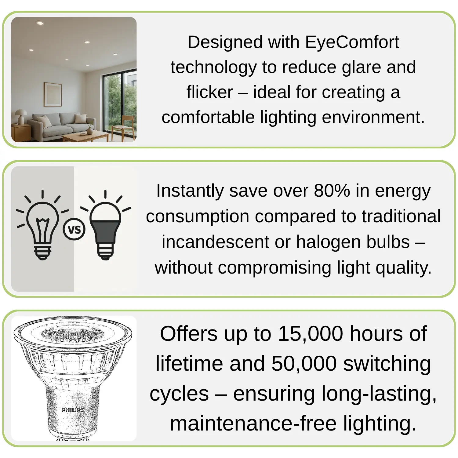Denna GU10 LED-lampa från Philips kombinerar funktionalitet med lång hållbarhet. Med en effekt på endast 4,6W sparar du upp till 80 % energi jämfört med halogen – utan att offra ljusstyrka. Perfekt för både hem och företag där ljuskvalitet och driftsäkerhet är viktigt. Passar i befintliga installationer utan behov av justering.Välj en energisnål LED-lampa med lång livslängd
