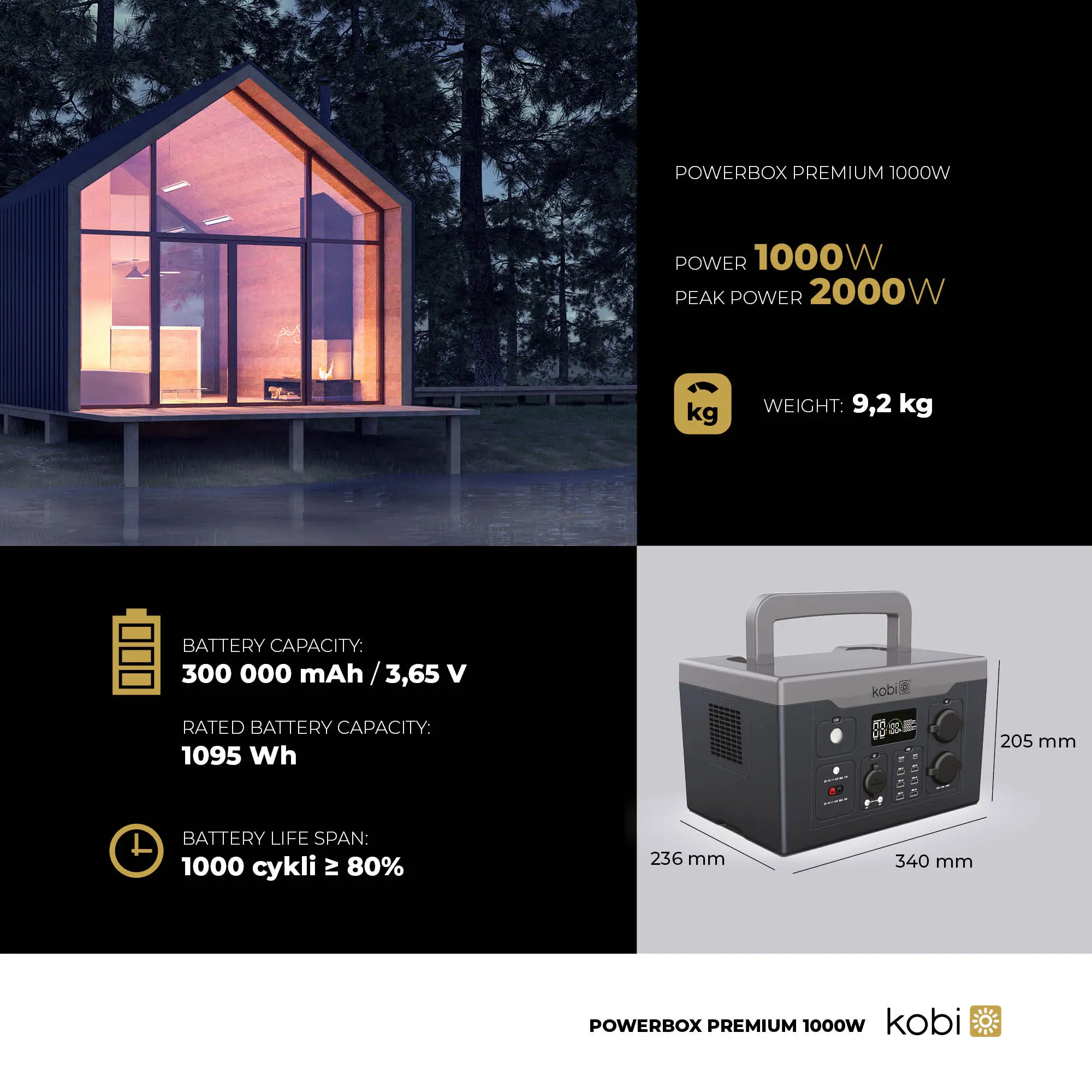 Kraftstationen är utrustad med ett li-jonbatteri, med en kapacitet på 3,65V, 300Ah och 1095Wh. Detta gör att du kan ge tillförlitlig ström under längre perioder innan du behöver ladda batteriet igen. På displayen visar kraftstationen förbrukningen, samt hur många timmar den kan dra anslutna enheter på en laddning.