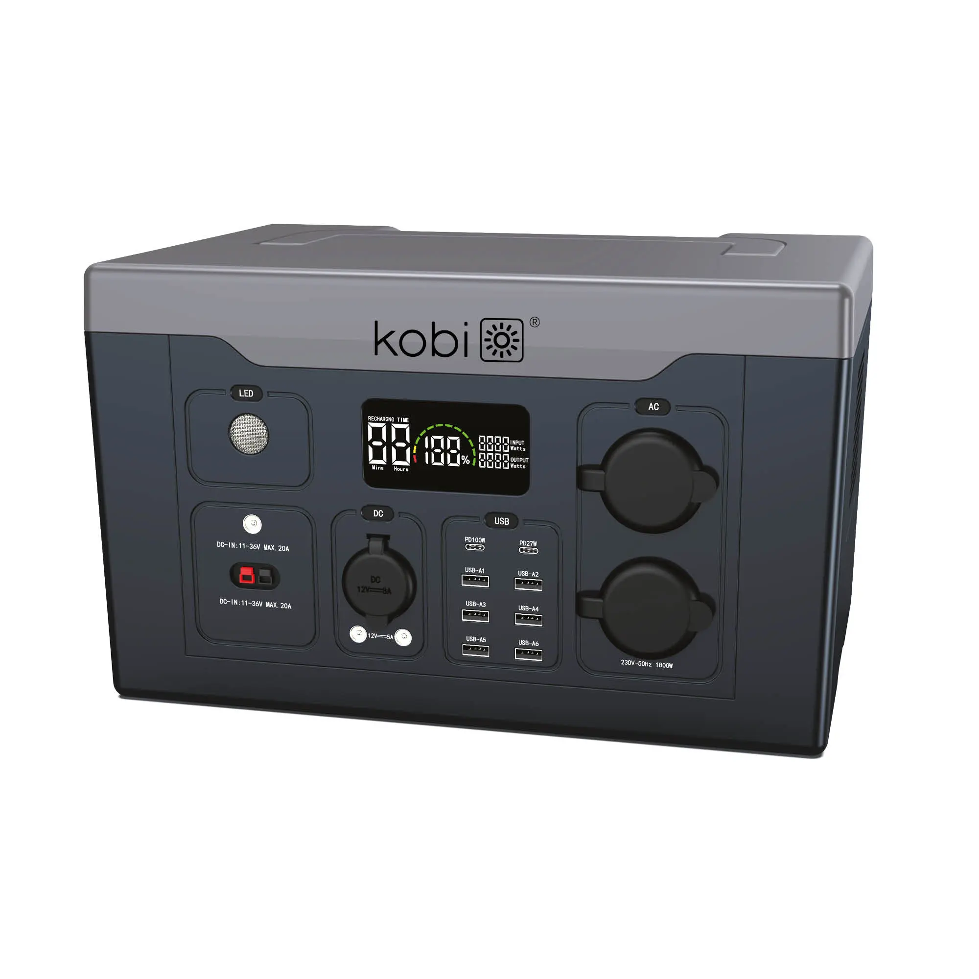 LED-display - LED-ljus - 6 USB-utgångar - 2 USB-C-utgångar - 2 x AC/230V-utgång - DC cigarettkontaktutgång - 2 DC-utgångar - Trådlös laddning - Cigarrkontaktingång - Solcellsladdningsingång - 4 laddningsalternativ