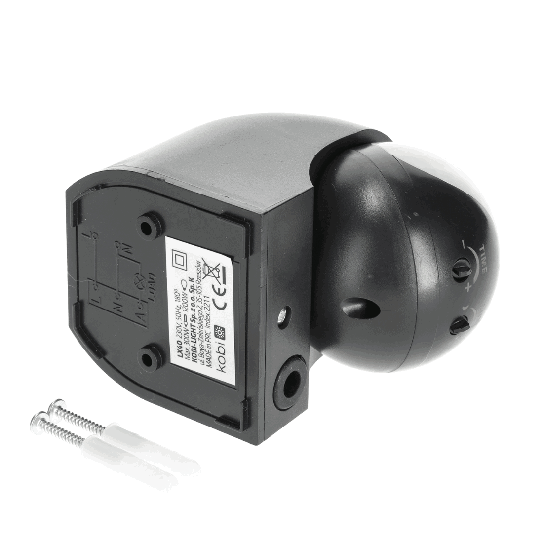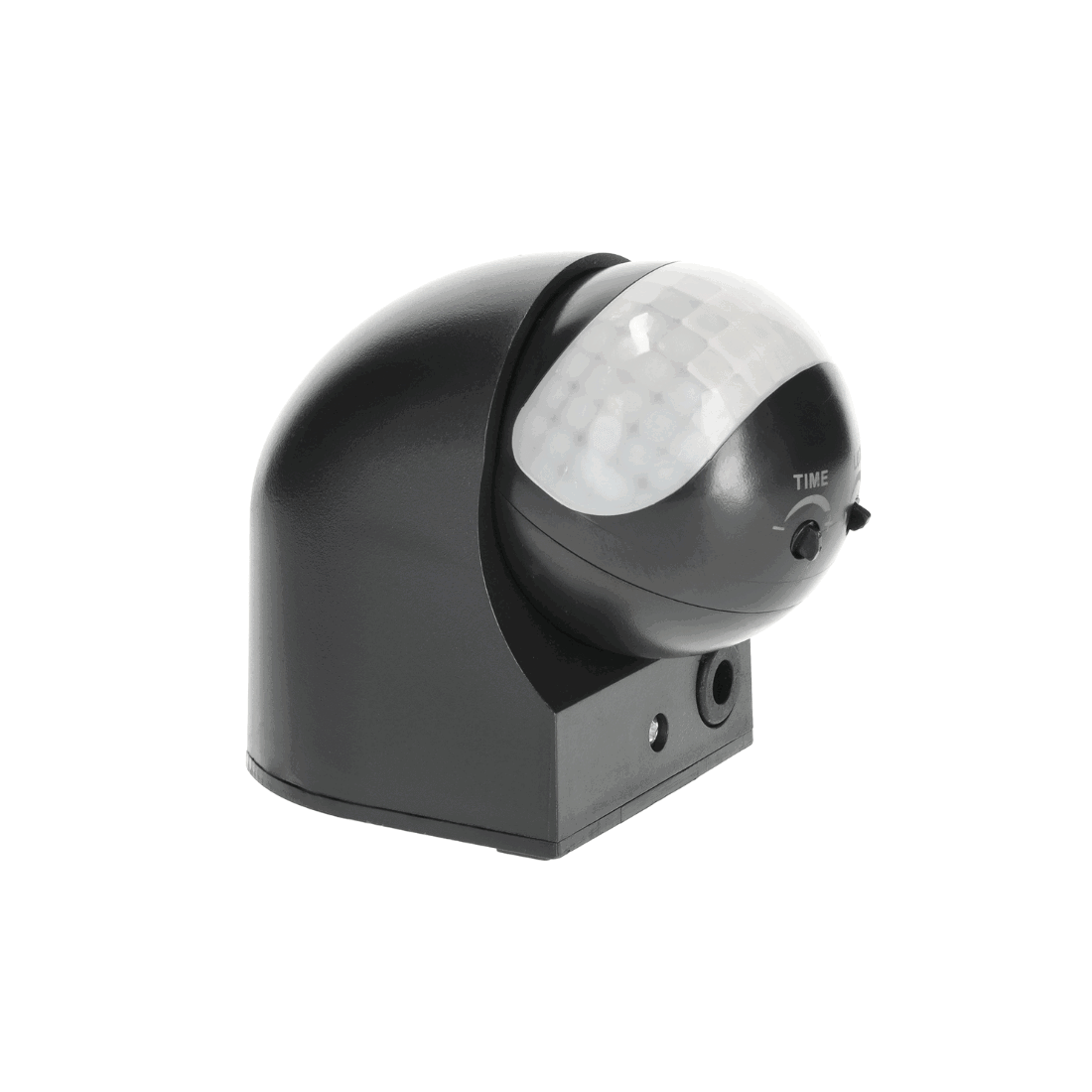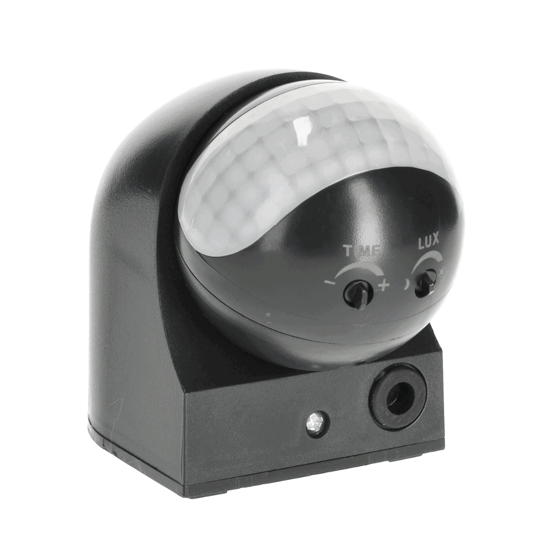 Rörelsesensor för utomhusbruk - PIR Sensor ( passiv infraröd) - Svart - Detektion upp till max 12m - IP44 - Justerbar ljuskänslighet 3 - 2000 lux - Justerbar avstängningsfördröjning 10 - 480sek - Detektionsvinkel: 180 grader