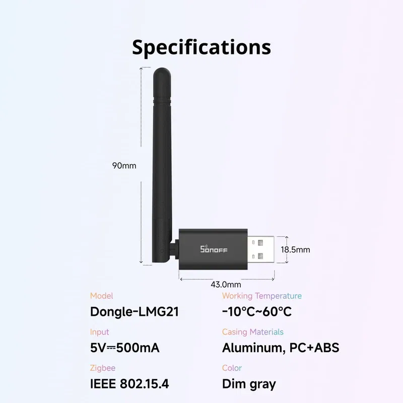 Gör ditt smarta hem redo med SONOFF Dongle Lite MG21. Den kompakta sonoff-gatewayen ansluter dina Zigbee-enheter till Home Assistant, Zigbee2MQTT och openHAB, ger fördröjningsfri lokal kontroll och kan placeras flexibelt med den medföljande USB-förlängningskabeln.