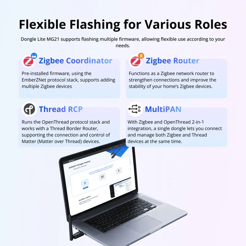 SONOFF Dongle Lite MG21 fungerar som en effektiv Zigbee-gateway som gör att du kan hantera dina smarta hemenheter enkelt och säkert. Med SONOFF Dongle Flasher-verktyget kan du snabbt ändra firmware eller uppdatera systemet utan tekniskt krångel. Denna dongle stöder flera driftsätt och ger dig full kontroll över hur dina Zigbee-enheter kommunicerar. I kombination med det stabila EFR32MG21-chippet får du en lösning som är snabb, energieffektiv och enkel att underhålla.