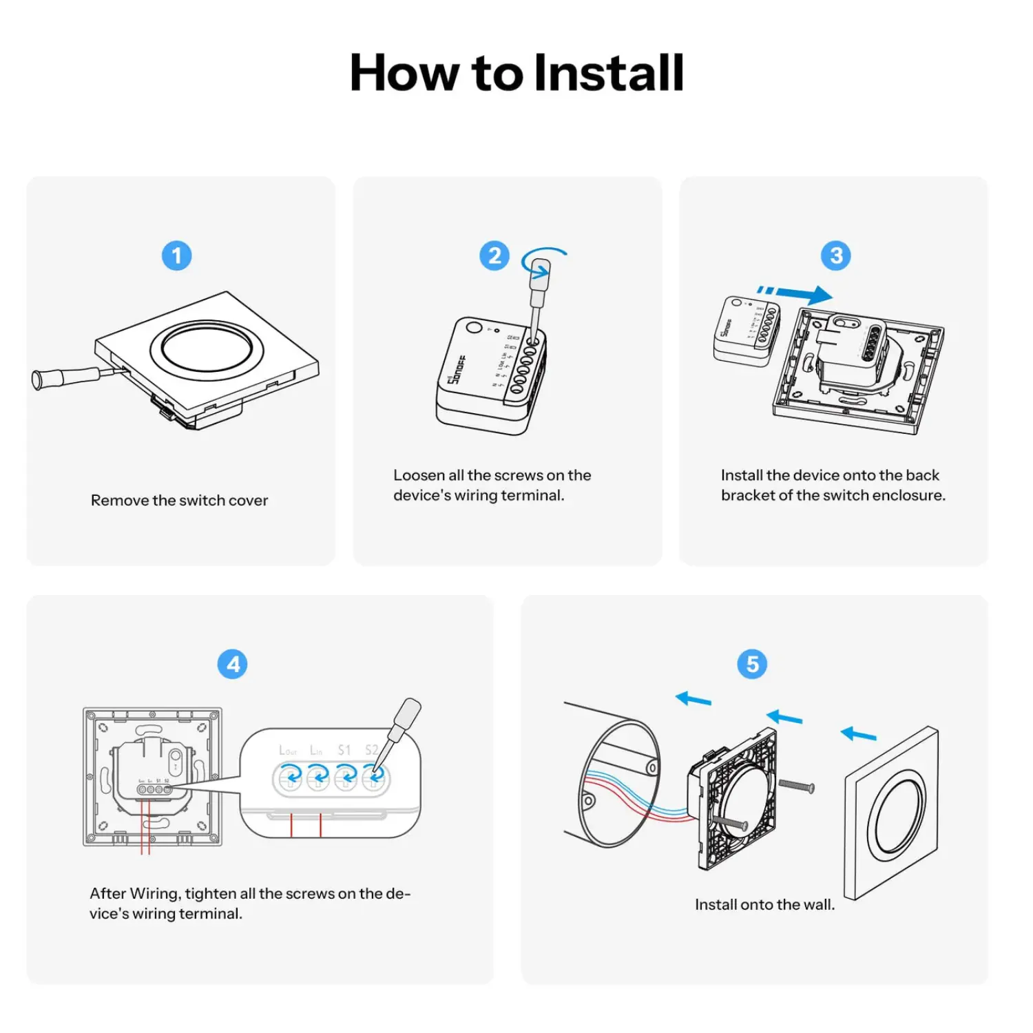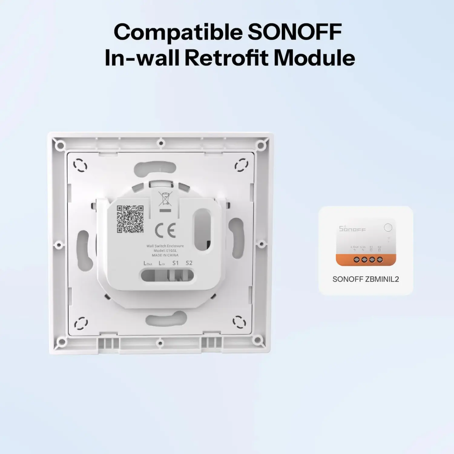 Ge din smarta väggströmbrytare en snygg och professionell finish med SONOFF E1GSL. Den smala fronten, den säkra clip-on-monteringen och de robusta materialen gör installationen snabb och snygg i runda EU-dosor.