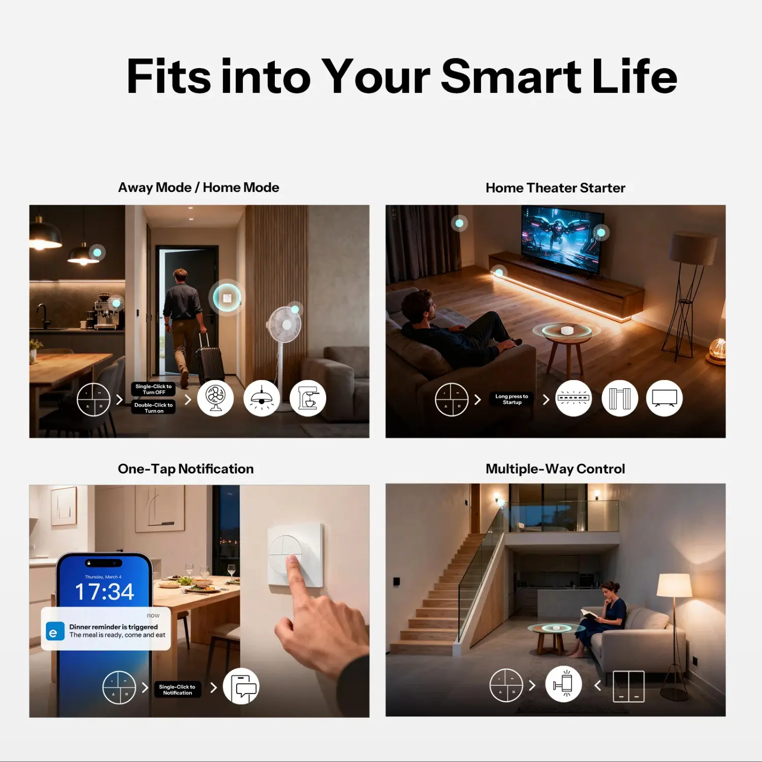 - Trådlös strömbrytare med upp till 16 scenåtgärder via 4 knappar och flera tryck (kort, lång och dubbeltryck)