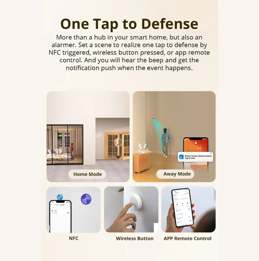 Förutom automatisering kan Zigbee Bridge Ultra även fungera som en larmenhet i ditt hem. Ställ in en smart scen som kan utlösas via NFC, trådlös knapp eller app, och få omedelbara notifikationer vid ovanliga händelser. Detta ger extra säkerhet och kontroll, oavsett om du är hemma eller på språng.