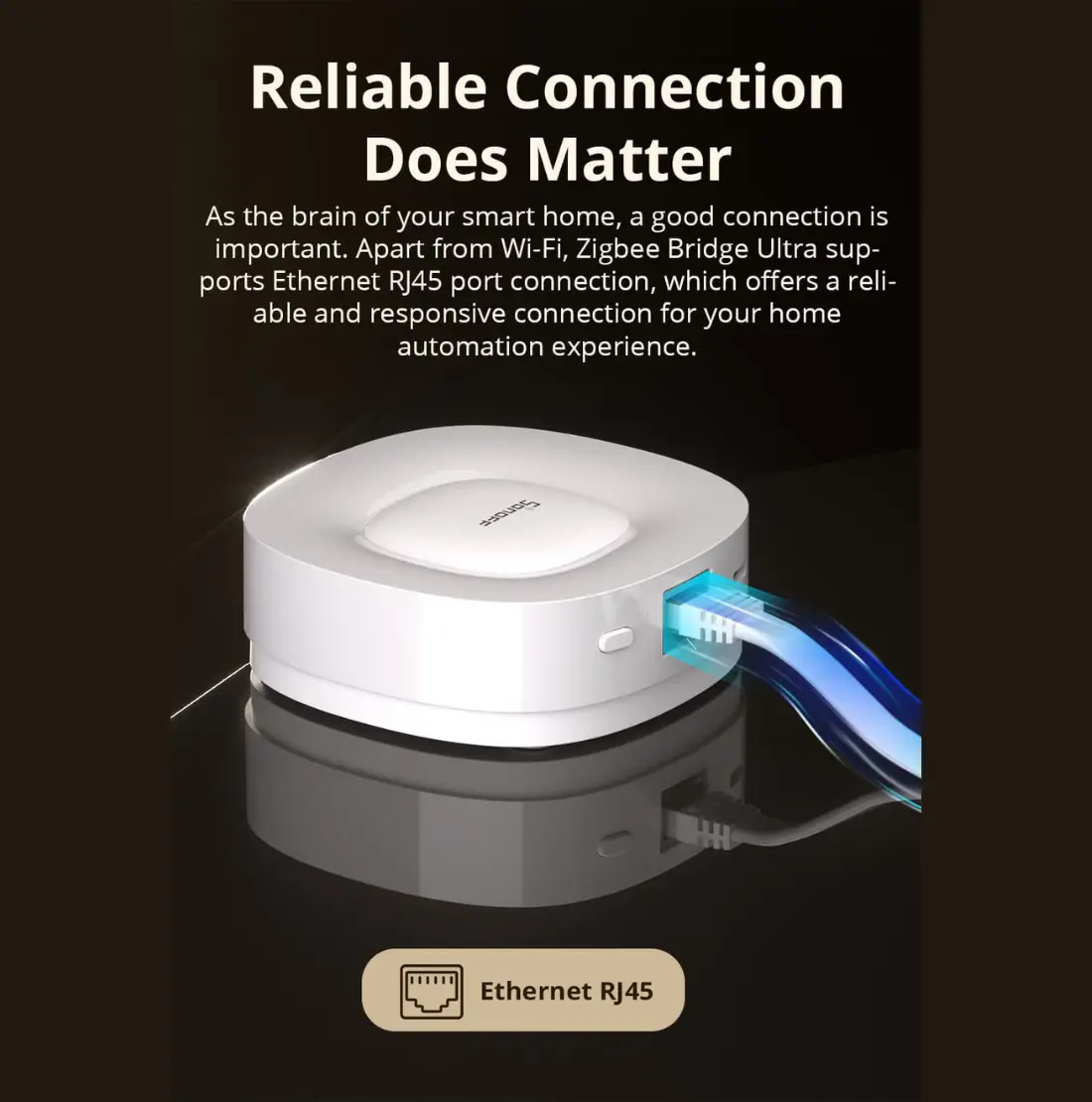 För att säkerställa en stabil och snabb anslutning erbjuder Zigbee Bridge Ultra både Wi-Fi och en RJ45 Ethernet-port. Ethernet anslutningen skapar en mer pålitlig anslutning till ditt smarta hem nätverk, så att du upplever färre förseningar och förbättrade svarstider när enheter aktiveras.