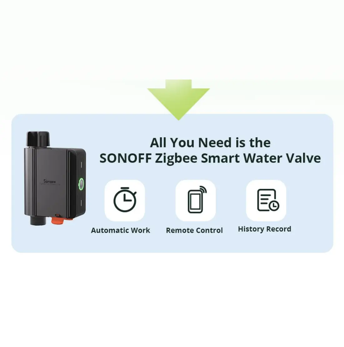 Automatisera din bevattning med Sonoff Zigbee Smart Vattenventil! Enkel installation mellan kran och slang. Med avancerade bevattningsinställningar och upp till 6 månaders datahistorik får du exakt kontroll över vattenförbrukningen och skyddar dina växter.