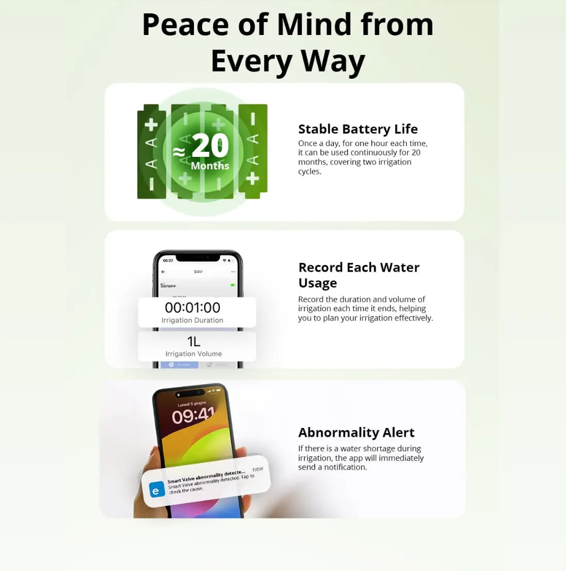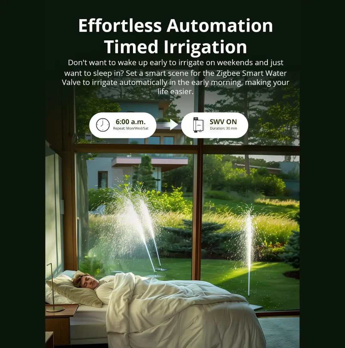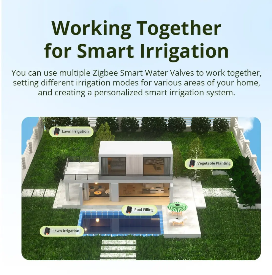 Med Sonoff Zigbee Smart Vattenventil får du avancerade bevattningsinställningar såsom scheman och kapacitetsläge, som möjliggör både engångs- och återkommande bevattning. Detta säkerställer en målinriktad och skräddarsydd omsorg för dina växter och grödor, så att de alltid får rätt mängd vatten.