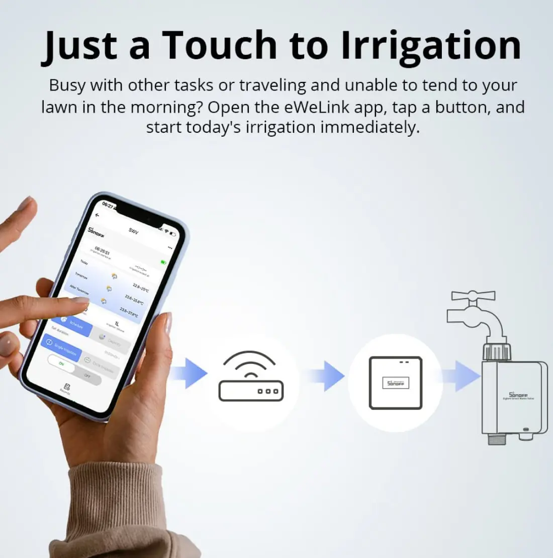 Sonoff Zigbee Smart Vattenventil gör det enkelt att uppgradera ditt bevattningssystem. Installationen är enkel mellan kran och slang, och systemet kan ställas in på några minuter. Denna lösning automatiserar bevattningen av både gräsmatta, trädgård och köksträdgård och erbjuder ett mer praktiskt och effektivt sätt att sköta dina växter utan onödig oro.