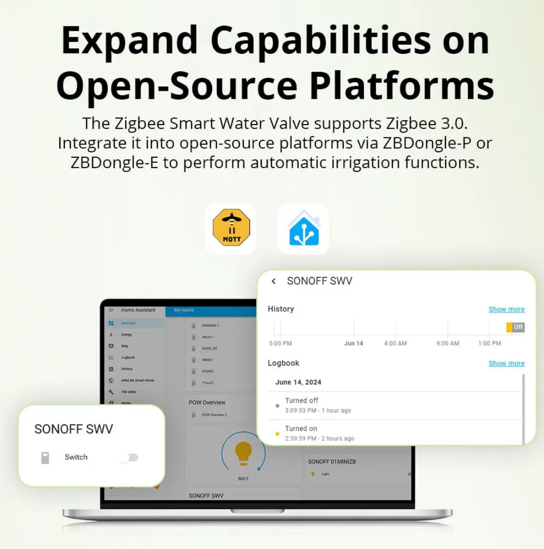 Denna vattenventil fungerar med Zigbee 3.0 hubb-lösningar såsom SONOFF NSPanel Pro, SONOFF ZB Bridge-P och Echo Plus 2nd. Integrationen säkerställer en stabil anslutning till ditt smarta hemsystem, vilket ökar funktionaliteten för din vattenhantering.