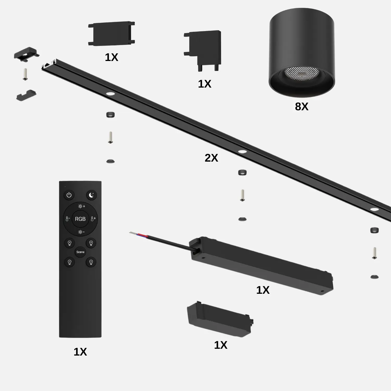 I paketet ingår två SlimTrack-skenor på 2 meter, åtta justerbara spotlights, ett kraftfullt 200 W LED-drivdon med smart styrning, ett kabelskydd, en fjärrkontroll och kontakter för anslutning av skenorna. Sammantaget får du ett komplett strömskenesystem som är enkelt att installera och lätt att anpassa till rummets utformning.