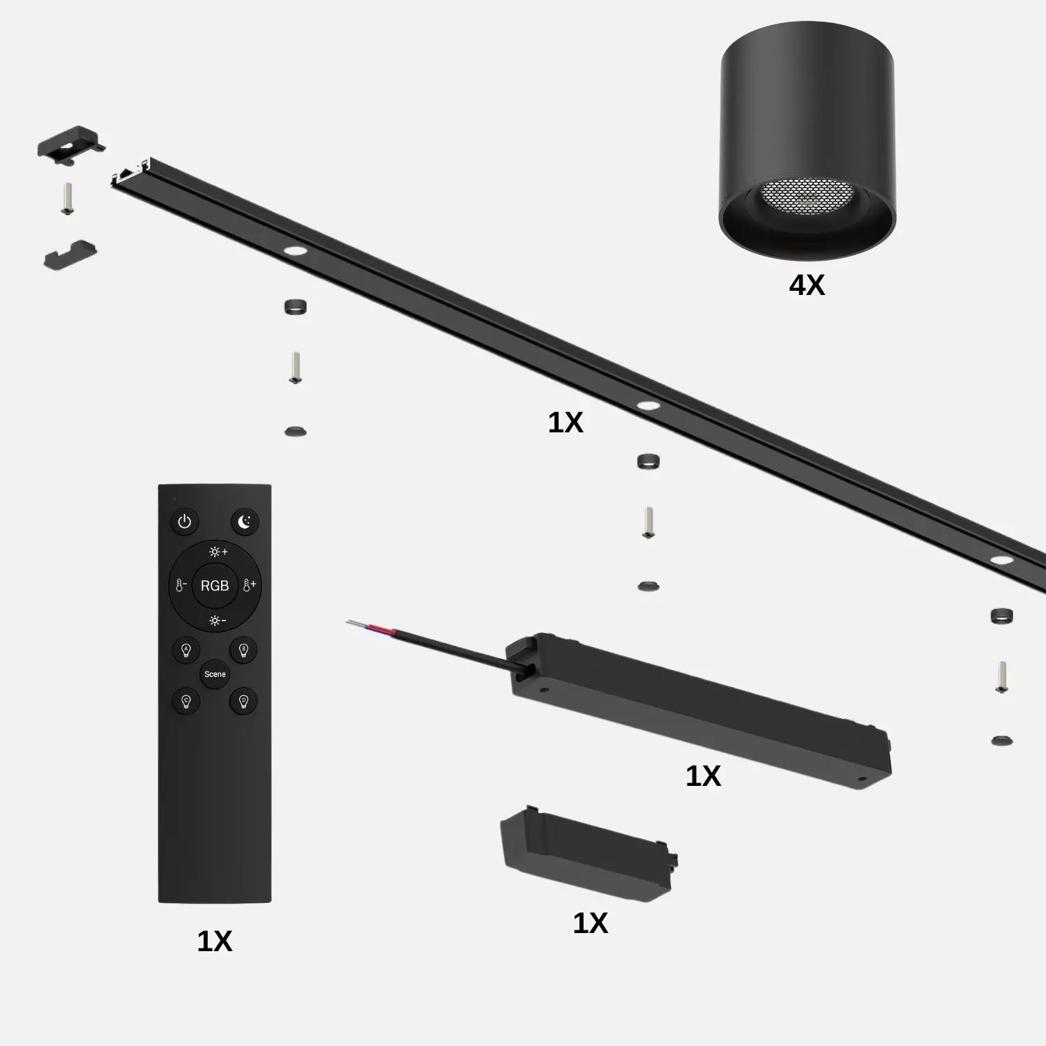 I paketet ingår en 2 meter lång SlimTrack-skena, fyra justerbara spotlights, en kraftfull 100W LED-driver med smart styrning, ett kabelskydd och en fjärrkontroll. Sammantaget får du ett funktionellt skensystem som är både lätt att installera och lätt att använda i vardagen.