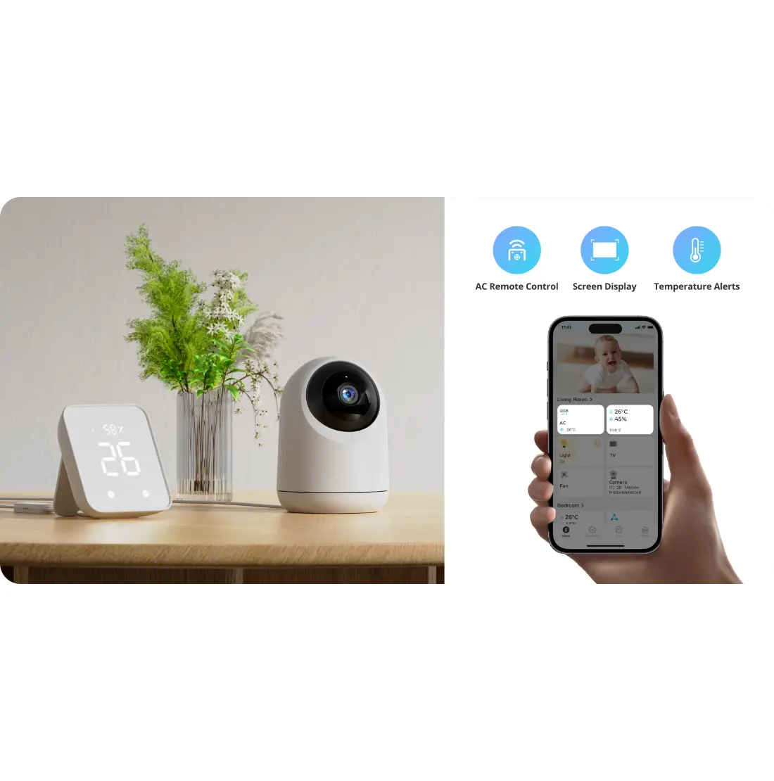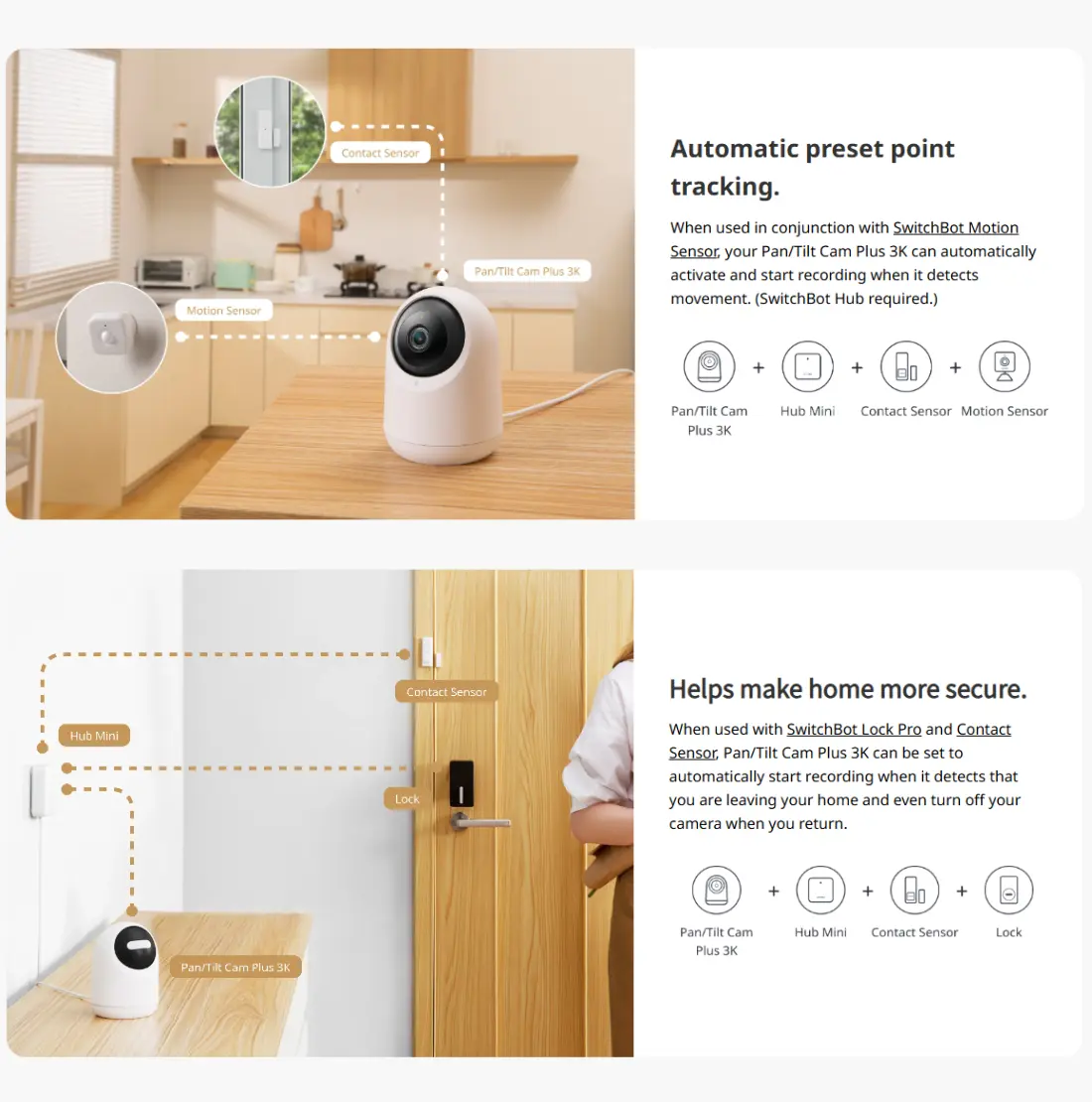 Anslut Pan/Tilt Cam 3K till SwitchBot Hub 2 för en helt automatisk lösning. Övervaka temperatur och luftfuktighet direkt från din smartphone och optimera inomhusklimatet genom att justera din luftkonditionering automatiskt. Kombinera med SwitchBot Lock Pro och Contact Sensor för en komplett säkerhetslösning som automatiskt spelar in när du lämnar hemmet.