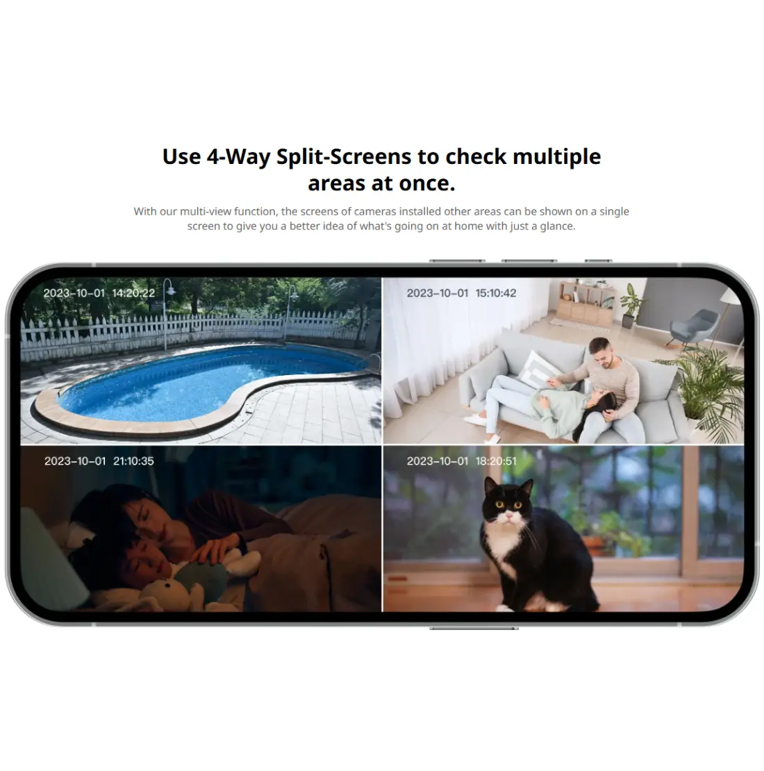 Placera kameran var som helst – på bordet eller monterad i taket. Med stöd för både SD-kort och molnlagring kan du välja den lösning som passar dig bäst. SD-kort stödjer upp till 256 GB lagring, vilket möjliggör kontinuerlig inspelning i upp till 42 dagar. Med molnlagring kan du få åtkomst till inspelningar när som helst och var som helst.