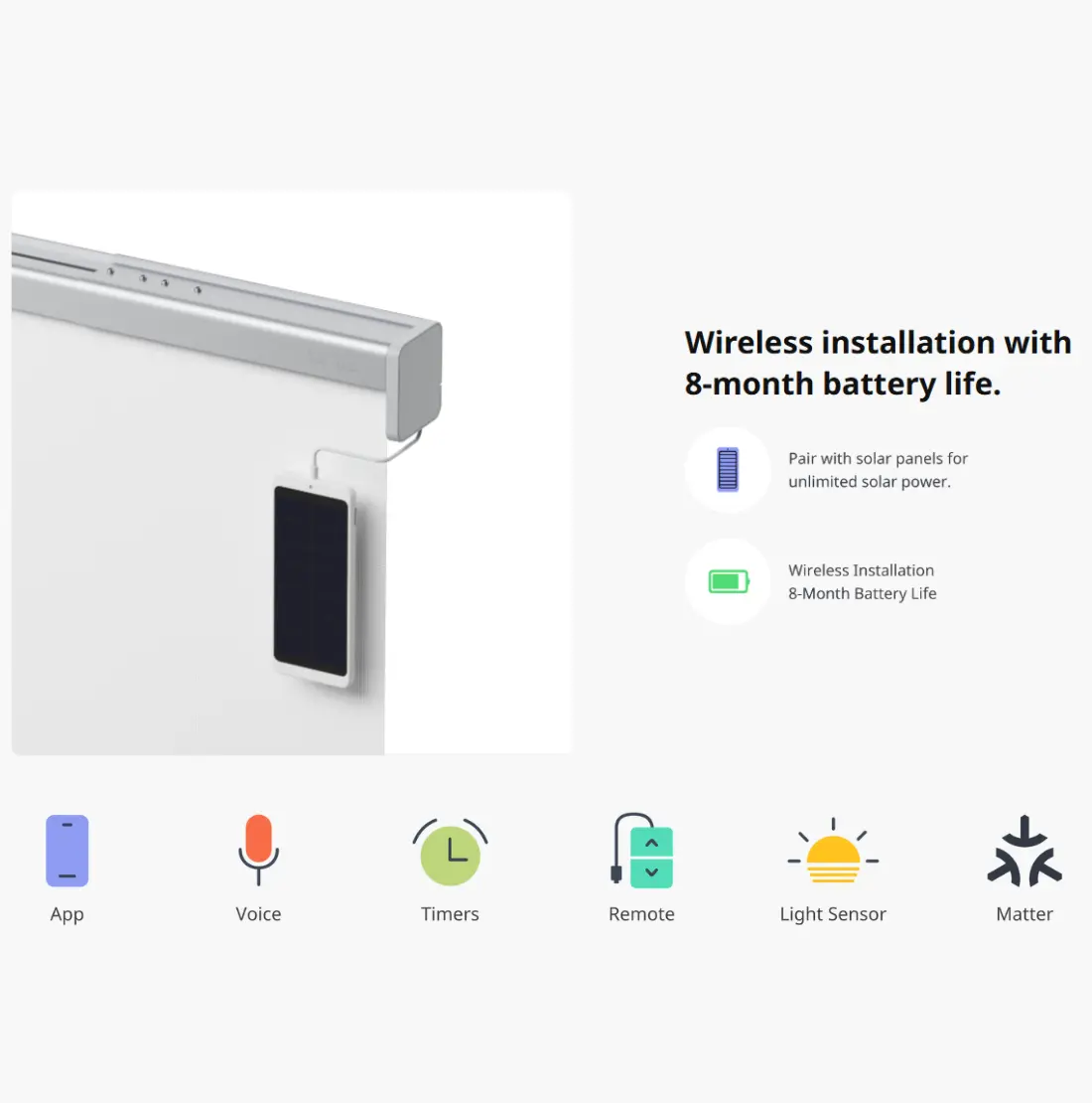 Gardinen är designad för trådlös installation och kräver ingen komplicerad uppsättning. Det inbyggda batteriet ger upp till 8 månaders ström med en enda laddning, vilket gör den till en bekymmersfri lösning för moderna hem.