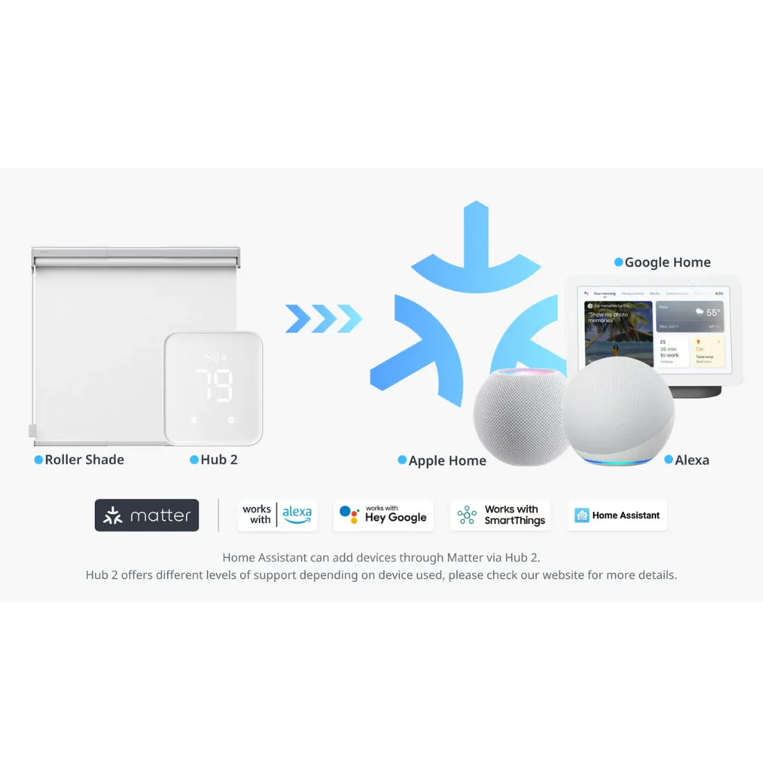 SwitchBot Roller Shade är kompatibel med Alexa, Google Assistant, Siri Shortcuts och andra smarthome-system. Genom att lägga till en SwitchBot Hub 2 kan du integrera gardinen i ett Matter-ekosystem för ännu större flexibilitet och kontrollmöjligheter.Lätt installation och lång batteritid