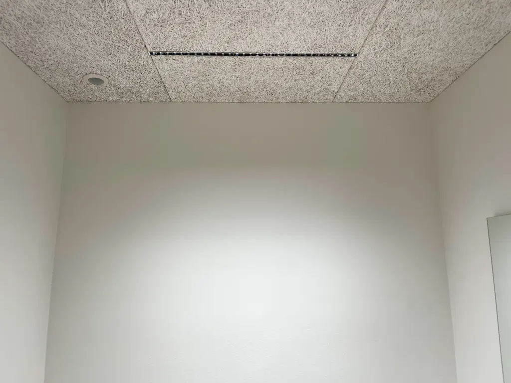 Med LED-ljus för Troldtekt undviker du att borra hål i mitten av skivorna, som man ofta gör med infällda spotlights. Istället placeras ljusrälsar (60 cm) vid skivornas kortsidor för ett minimalistiskt uttryck. Rälsarna finns i 25 mm höjd. Den 38° ljusvinkeln ger en jämn fördelning, lämplig för kontor, mötesrum, kök/allrum och andra utrymmen där ett lugnt ljus med låg bländning är viktigt.