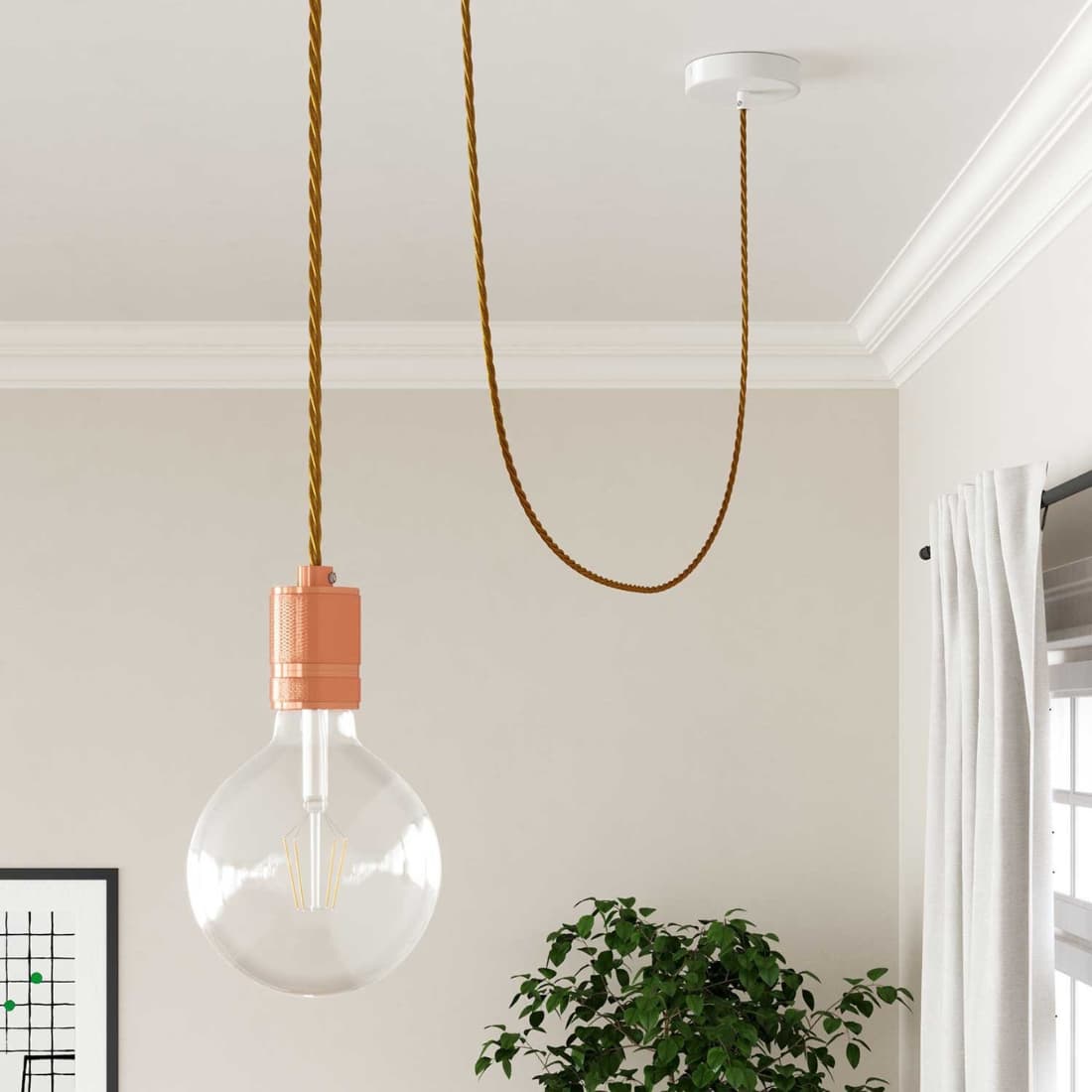 Inom detta färgspektrum sticker den guldiga tvinnad textilkabeln från Creative Cables ut som ett exempel på tidlös elegans. Den guldiga tvinnad textilkabeln kan enkelt integreras i vilken design som helst, från modern till klassisk, vilket gör denna guldiga tvinnad textilkabel särskilt mångsidig. En guldig tvinnad textilkabel tillför en touch av sofistikation och kan fungera som ett iögonfallande, men kraftfullt designelement som kompletterar både ljusa och mörka färgteman. Genom att välja denna guldiga tvinnad textilkabel får du en lösning som inte bara är praktisk, utan som också bidrar till rummets estetik med en känsla av värme och karaktär.