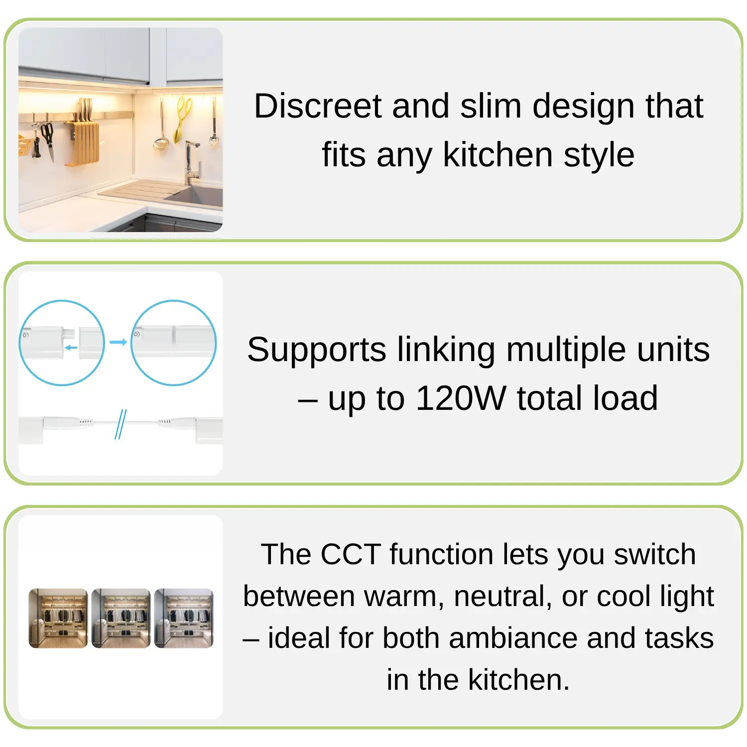 När du vill ha en snygg och funktionell lösning för belysning under köksskåp är denna LED-underbelysning ett säkert val. Den ger ett jämnt och kraftfullt ljus som gör matlagning och rengöring enklare. Den diskreta designen smälter perfekt in under överskåp. Med möjlighet att välja mellan tre färgtemperaturer kan ljuset anpassas för både dag- och kvällsbruk.Praktisk underbelysning med flera funktioner