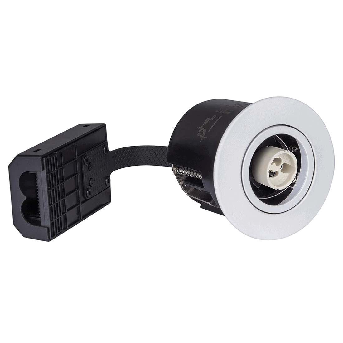 Vit Gu10 inbyggd spot med 35° lutningsvinkel. Den inbyggda spotlighten har en inbyggd höjd på 68 mm, samt ett enkelt klicksystem för Gu10 ljuskälla, utan synlig monteringsfjäder på framsidan.