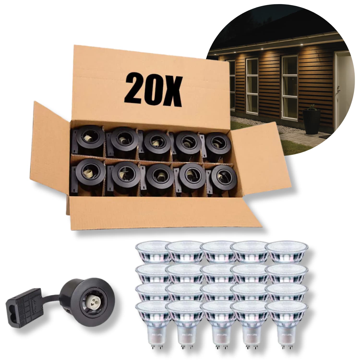 Förpackning med 20 st GU10 utomhusspotlights i mattsvart och 20 st GU10-lampor från Philips Master-serien