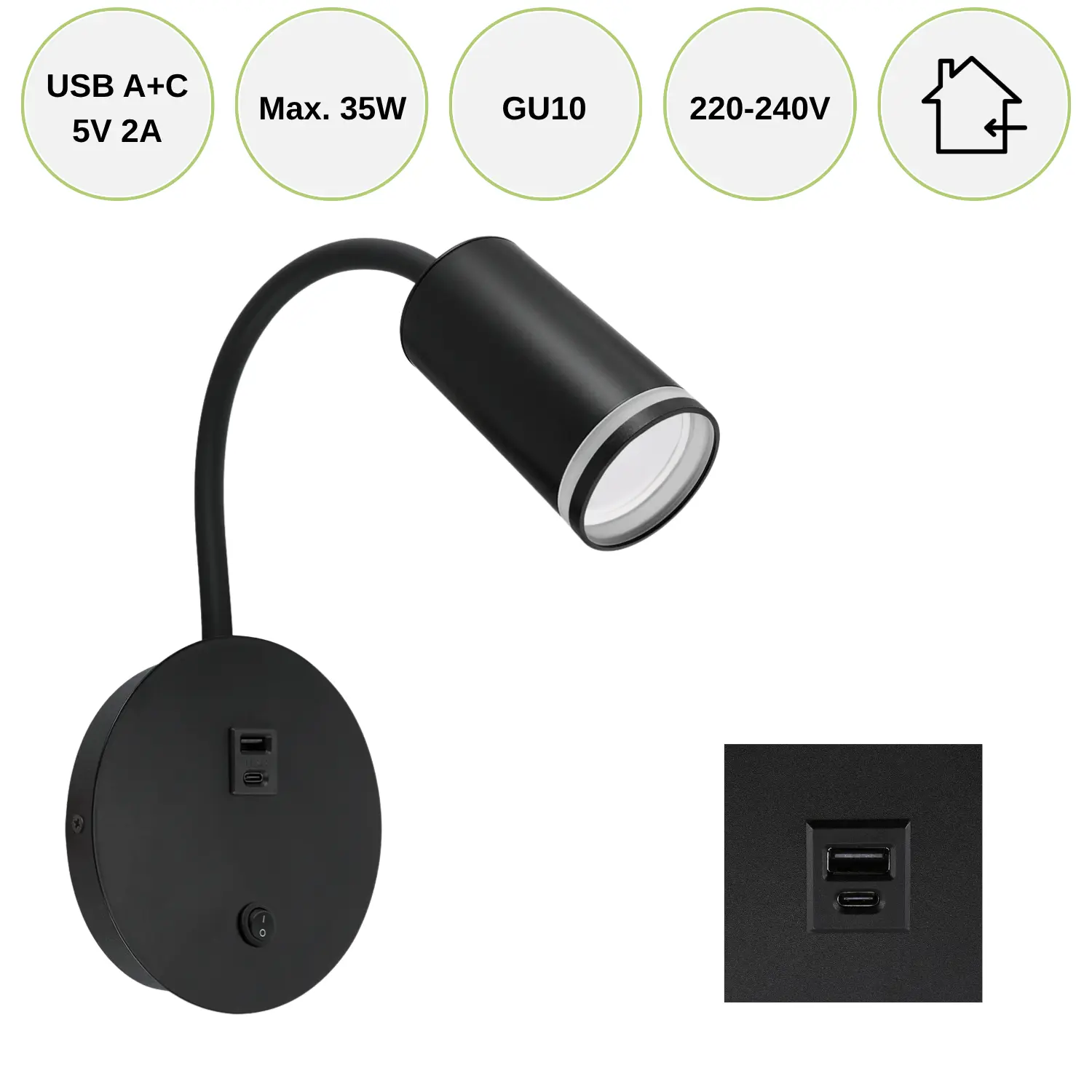 Produktinformation "Väggmonterad sänglampa med USB | USB Typ A + C | GU10 | ZULA | Svart"