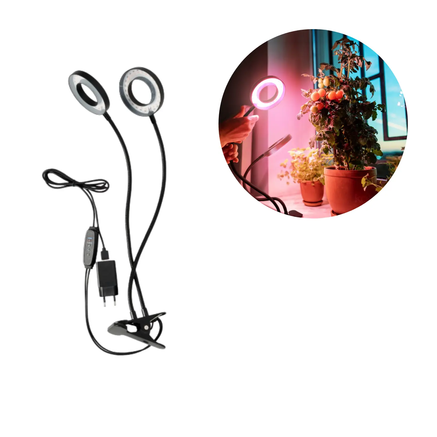 Den inbyggda inline-kontrollern gör vardagen enkel med dimmer och tre fasta timerprogram: 3 tim. på / 21 tim. av, 9 tim. på / 15 tim. av och 12 tim. på / 12 tim. av. Sätt en fast rytm för dina växter, även när du inte är hemma. De två ringlamporna kan justeras oberoende för jämn täckning av flera krukor, och ljuset kan finjusteras så att känsliga plantor inte blir överbelysta. Perfekt för köksörter, krukväxter i mörka hörn, balkongodlingar och små växthus. Observera: Inte avsedd som vanlig belysning i bostadsrum – detta är specifikt utvecklat för växttillväxt.