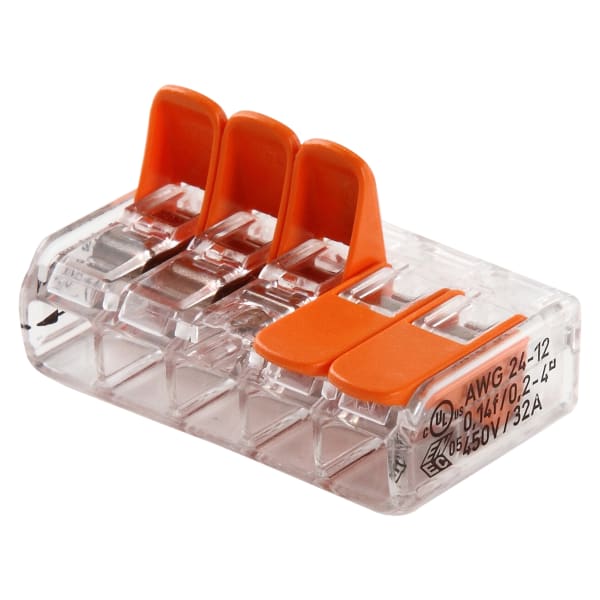 Wago Transparent Samlemuffe 5 x 0,2-4mm2 är en del av samlemuffefamiljen i serie 221, vilket ger elektriker och installatörer möjlighet att utföra en snabbare, enklare och säkrare installation av många olika typer av ledare. Den lämpar sig för både enfärgade, flerfärgade och flexibla ledare. Med en tillåten märkström på 32 A och en märkspänning på 450 V är serie 221 lämplig för användning i 230/400 V-nät.