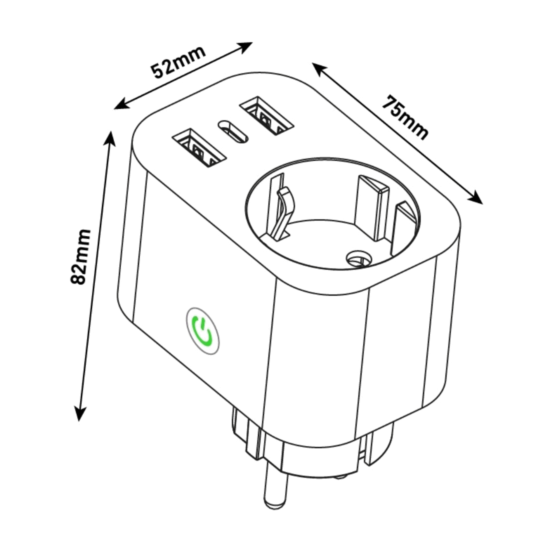 Den här multifunktionella laddningsadaptern är perfekt för hemmet eller kontoret. Den har ett Schuko-uttag, två USB-A-uttag och ett USB-C-uttag, vilket gör den otroligt mångsidig. Med ett Schuko-uttag på max 16A, två USB-A-uttag på max 5V/2,4A vardera och ett USB-C-uttag på max 5V/2,4A kan du ladda flera enheter samtidigt.Smart Plug kompatibel med Google Assistant och Amazon Alexa